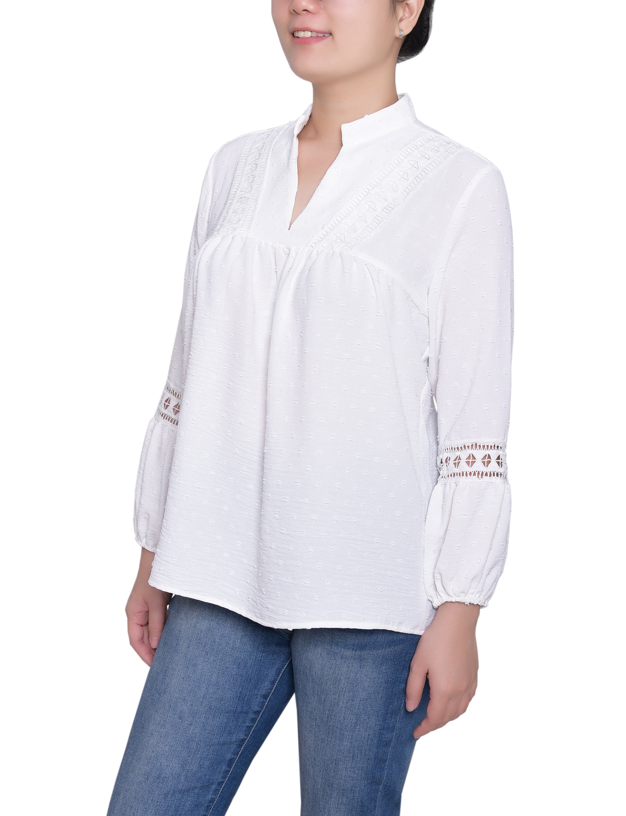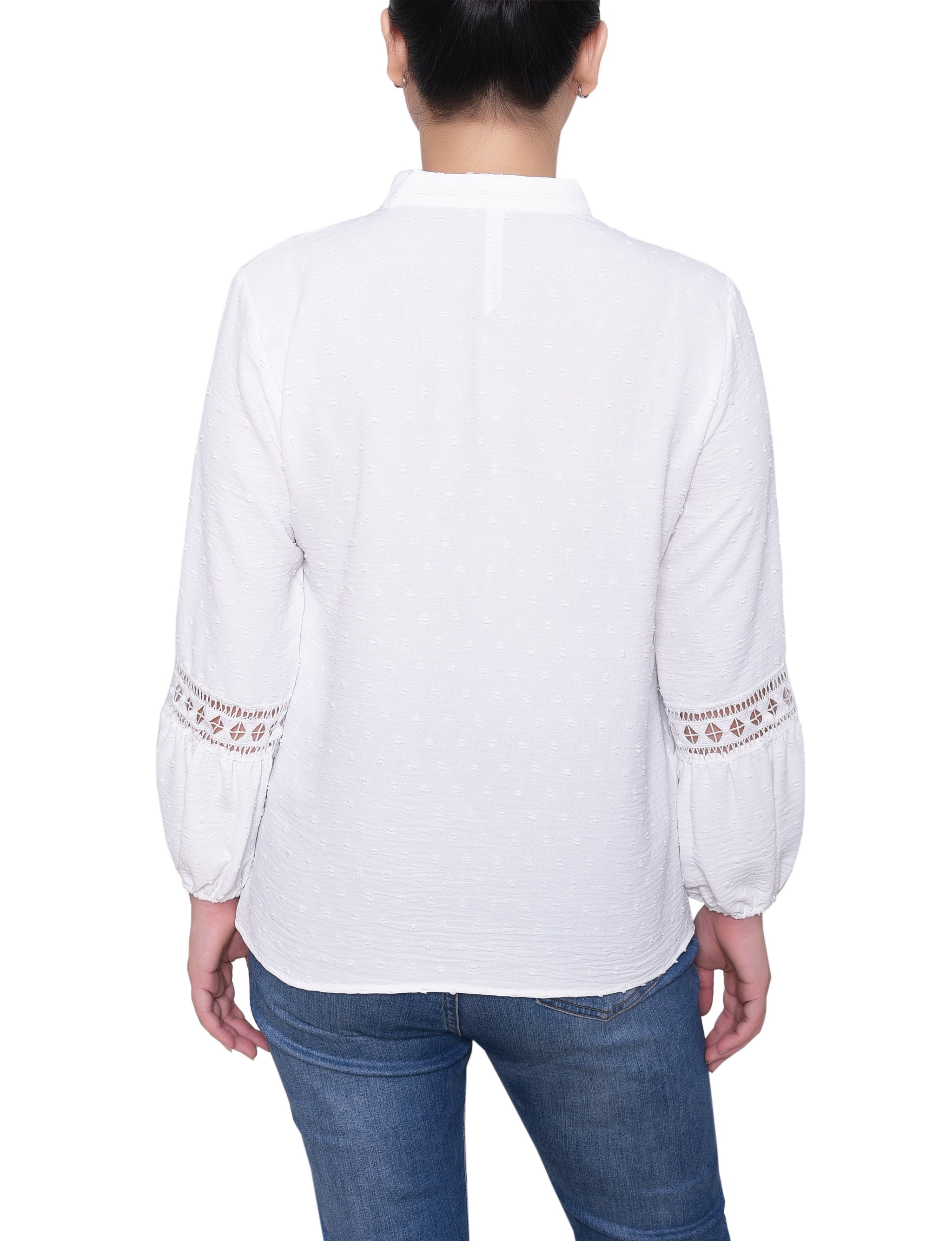 Crochet and lace details from NY Collection make this lightly textured blouse perfect for a day at the office or hanging with friends.