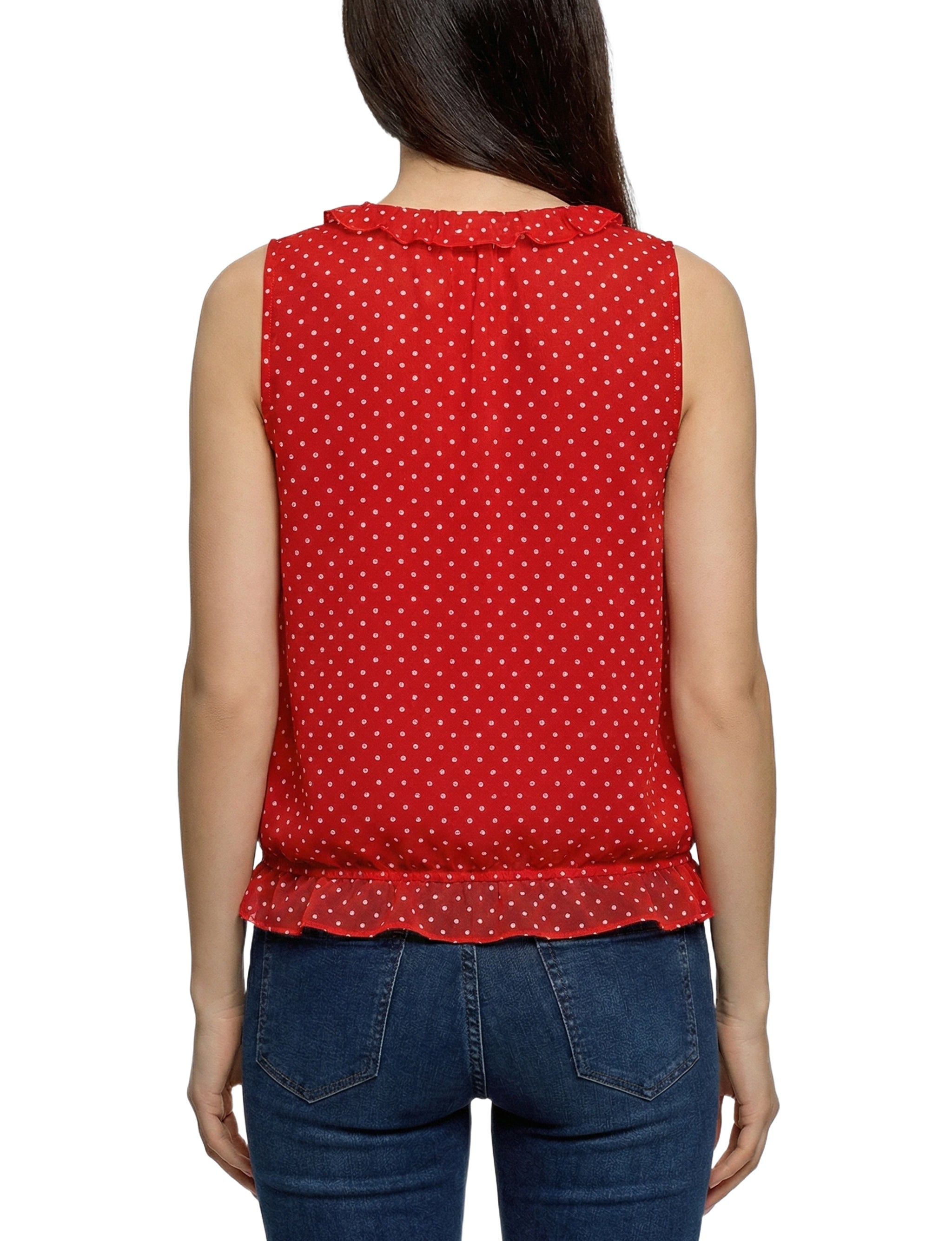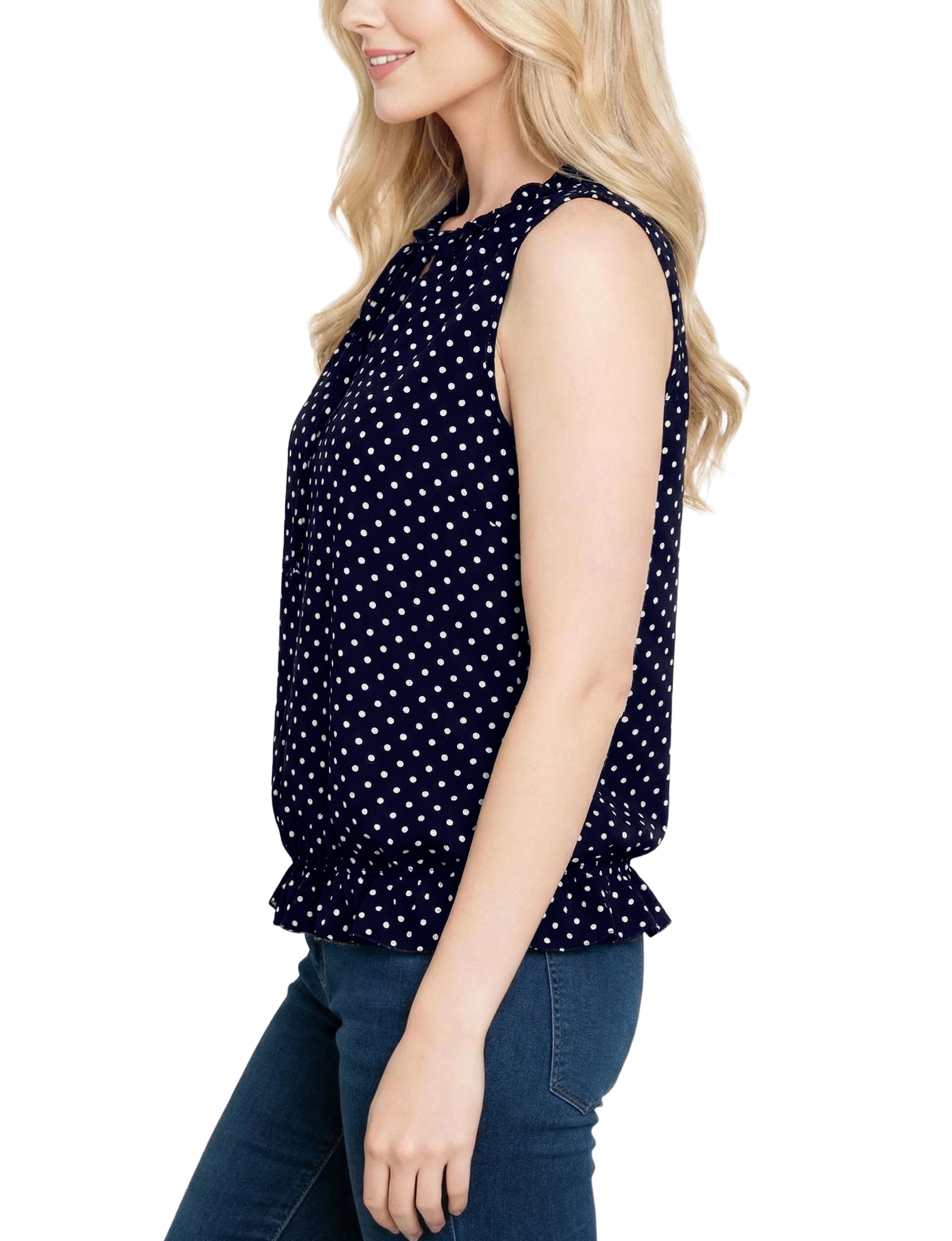 This sleeveless NY Collection blouse features a playful polka-dot print with a feminine ruffled neckline and adjustable tie-front detail. Finished with a softly ruffled hem, it offers a flattering, lightweight look that’s easy to dress up or down.