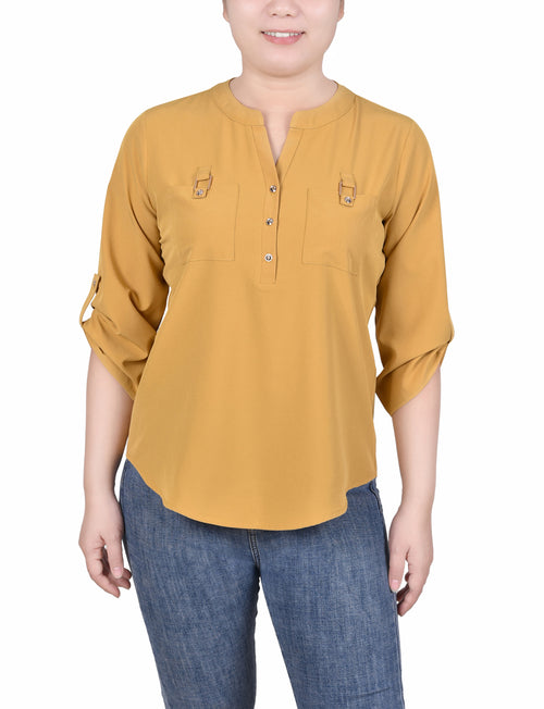 Petite 3/4 Sleeve Roll Tab Y Neck Blouse