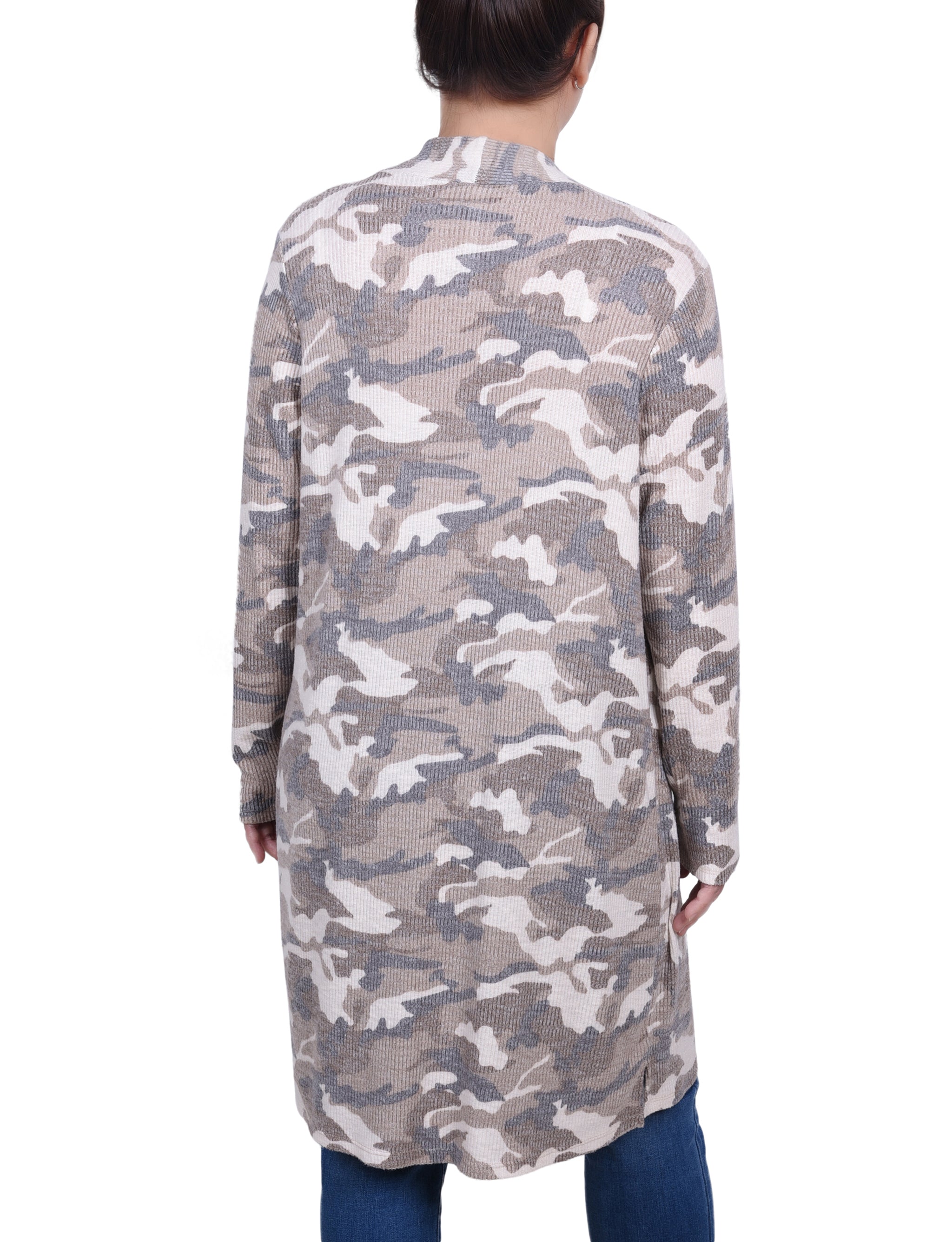 Elevate your casual style with this NY Collection long open-front cardigan in a chic camouflage print. Designed with a relaxed fit, soft rib-knit texture, and convenient front pockets, it’s the perfect layering piece for any season.
