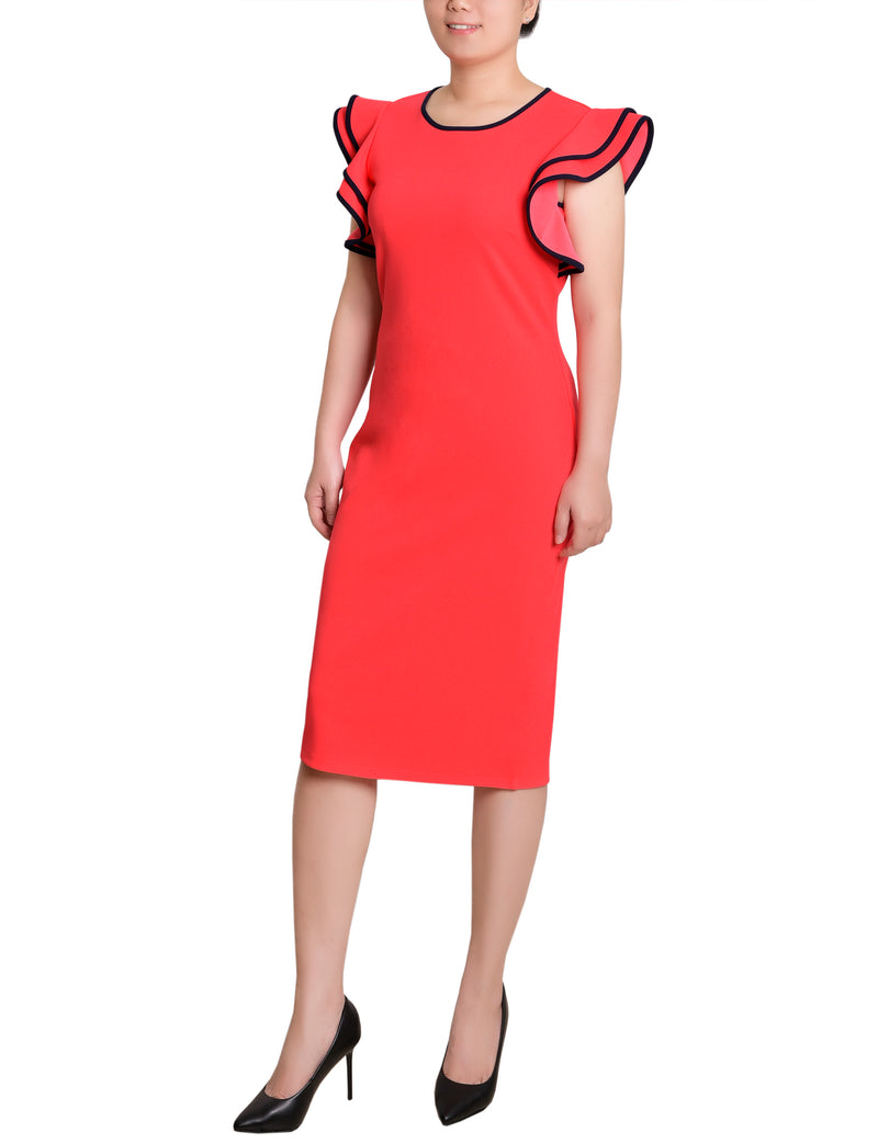 This NY Collection Ruffle Sleeve Dress with Contrast Tipping is a stylish and versatile addition to any wardrobe. The slim silhouette and scuba crepe fabric ensure a comfortable and flattering fit, making it an ideal choice for various occasions.