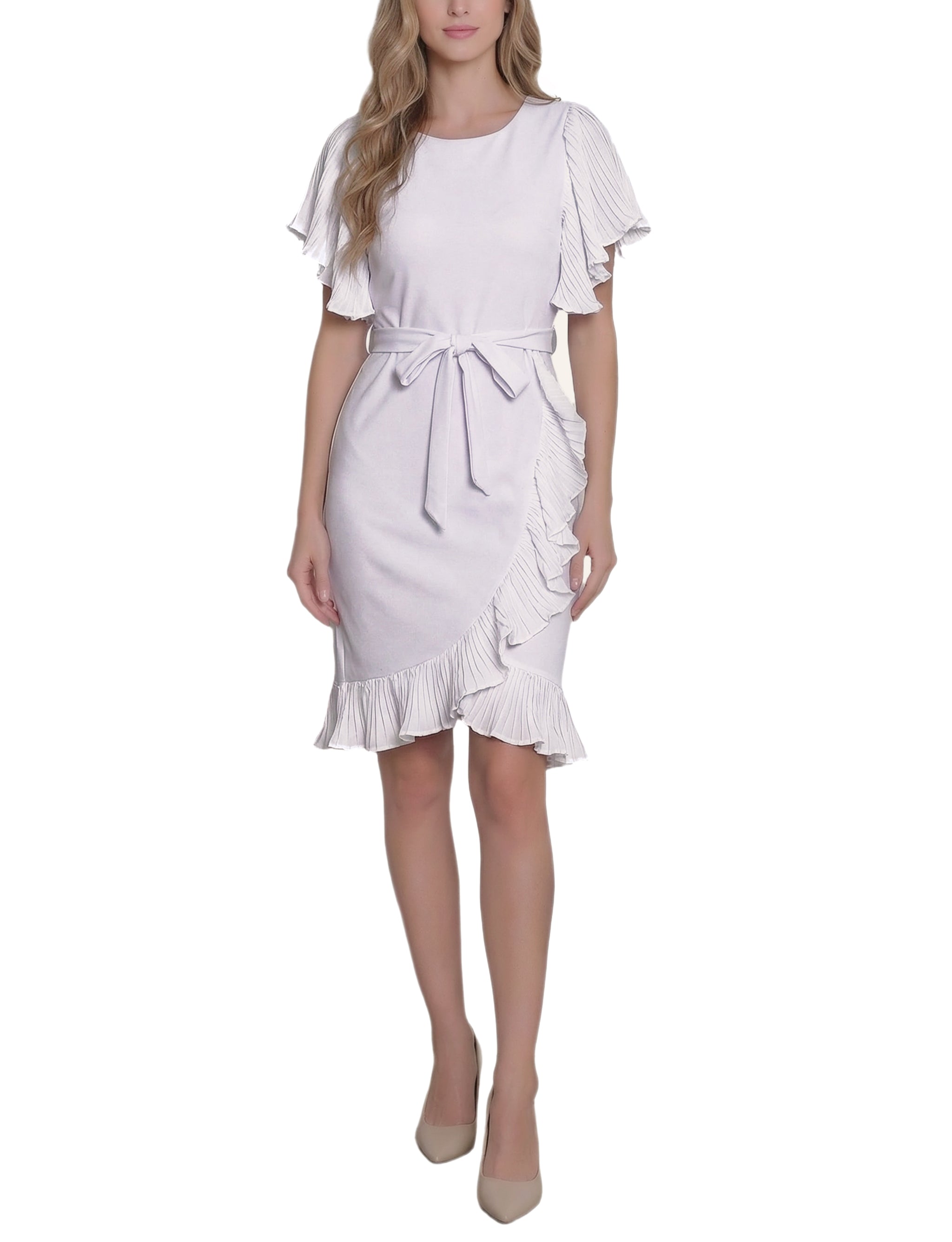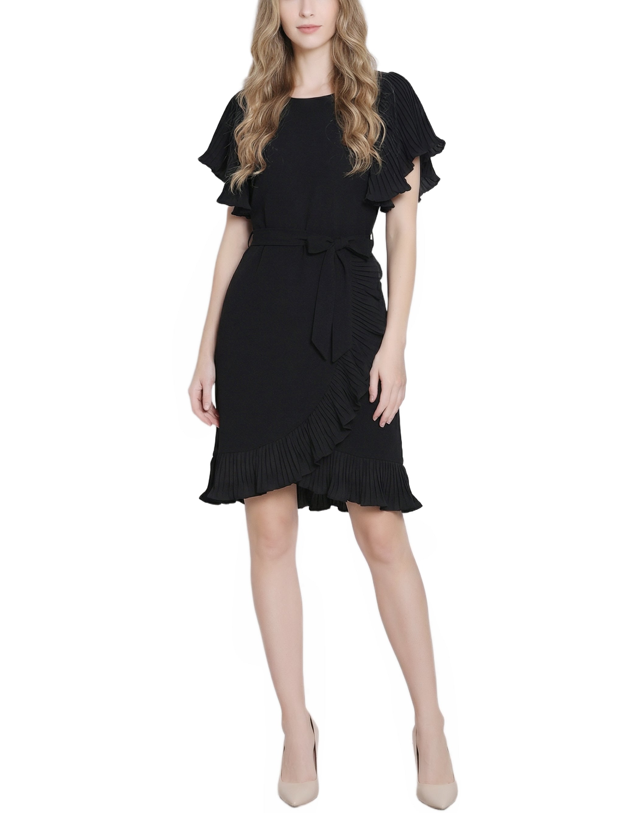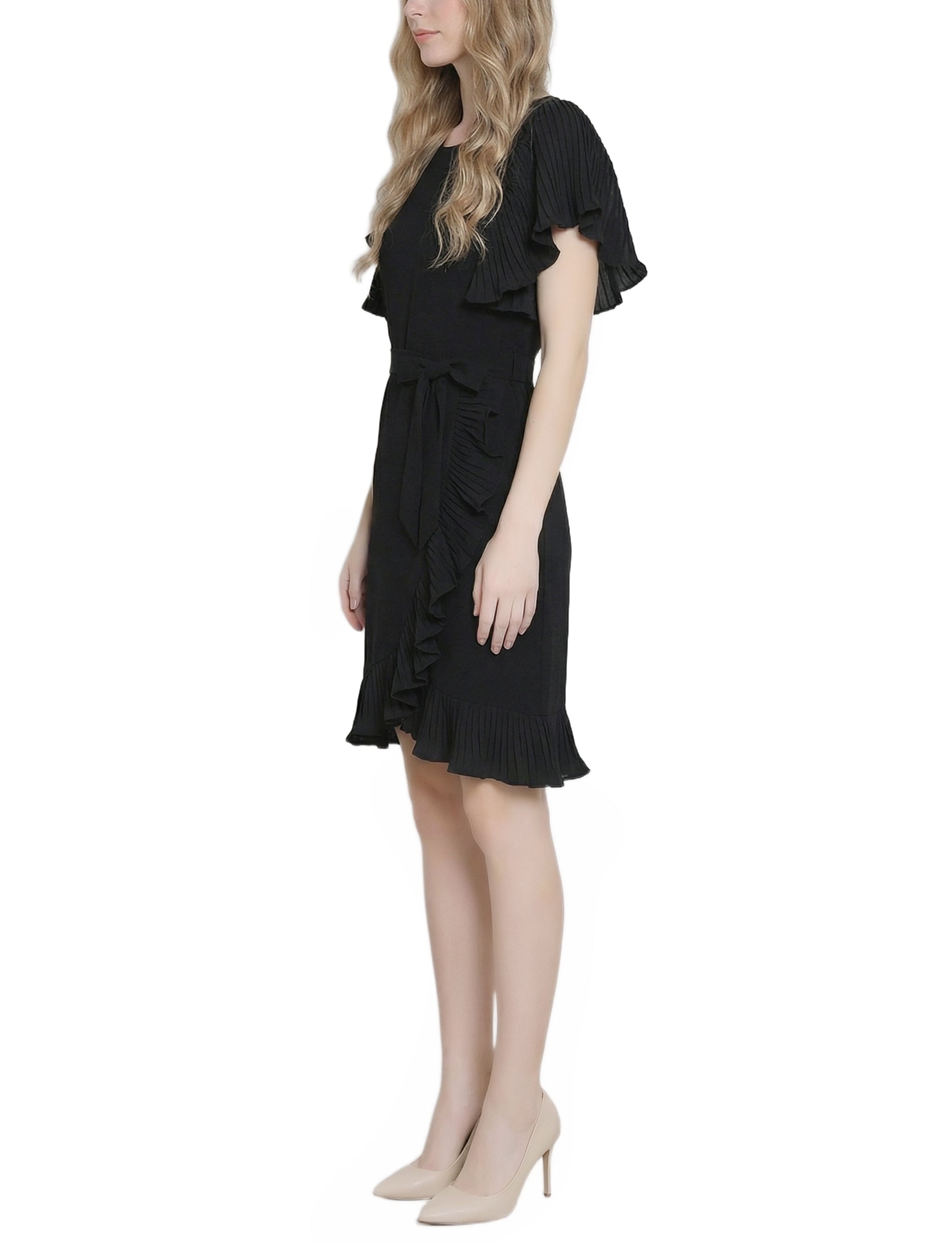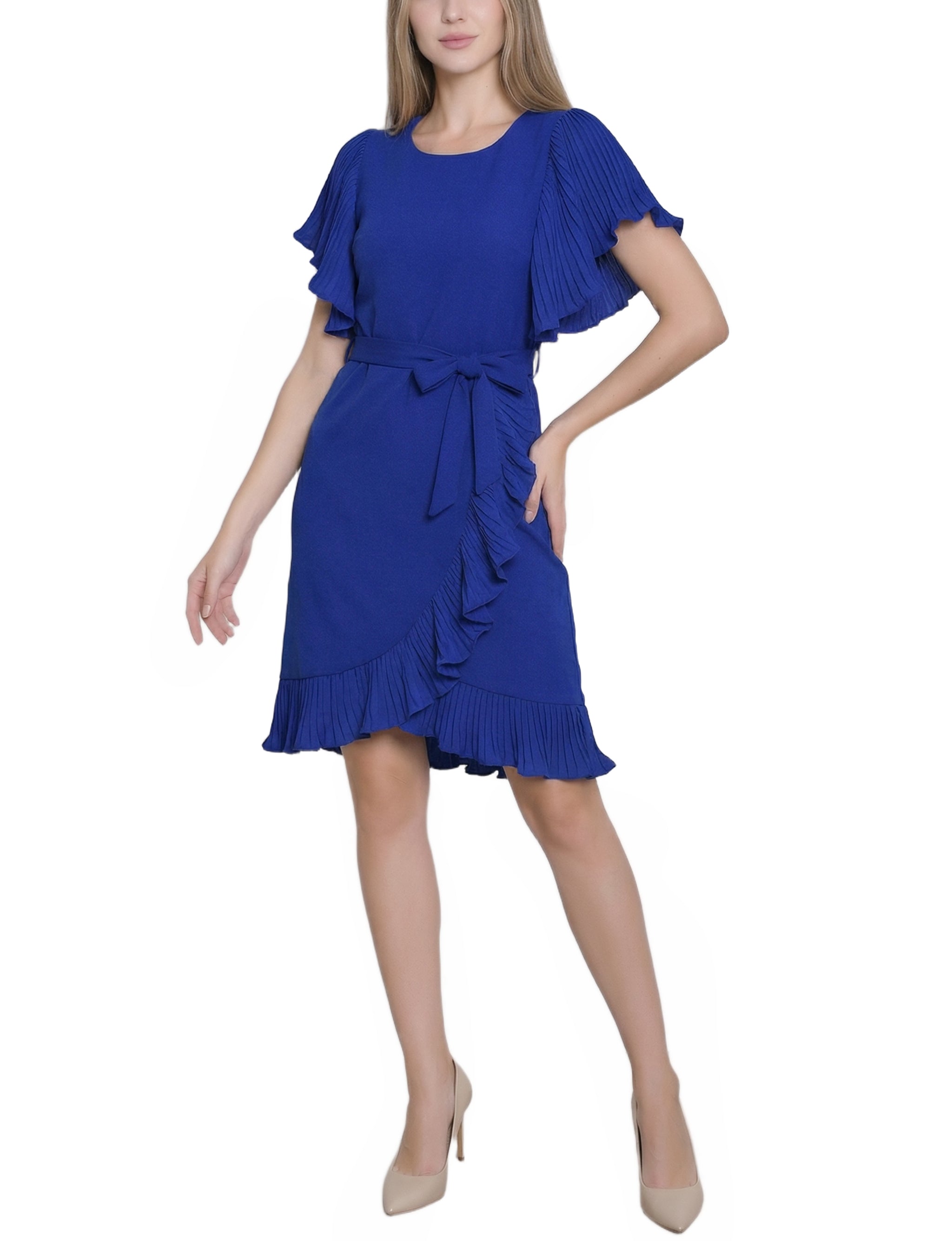 Petite Short Sleeve Pleated Ruffle Dress