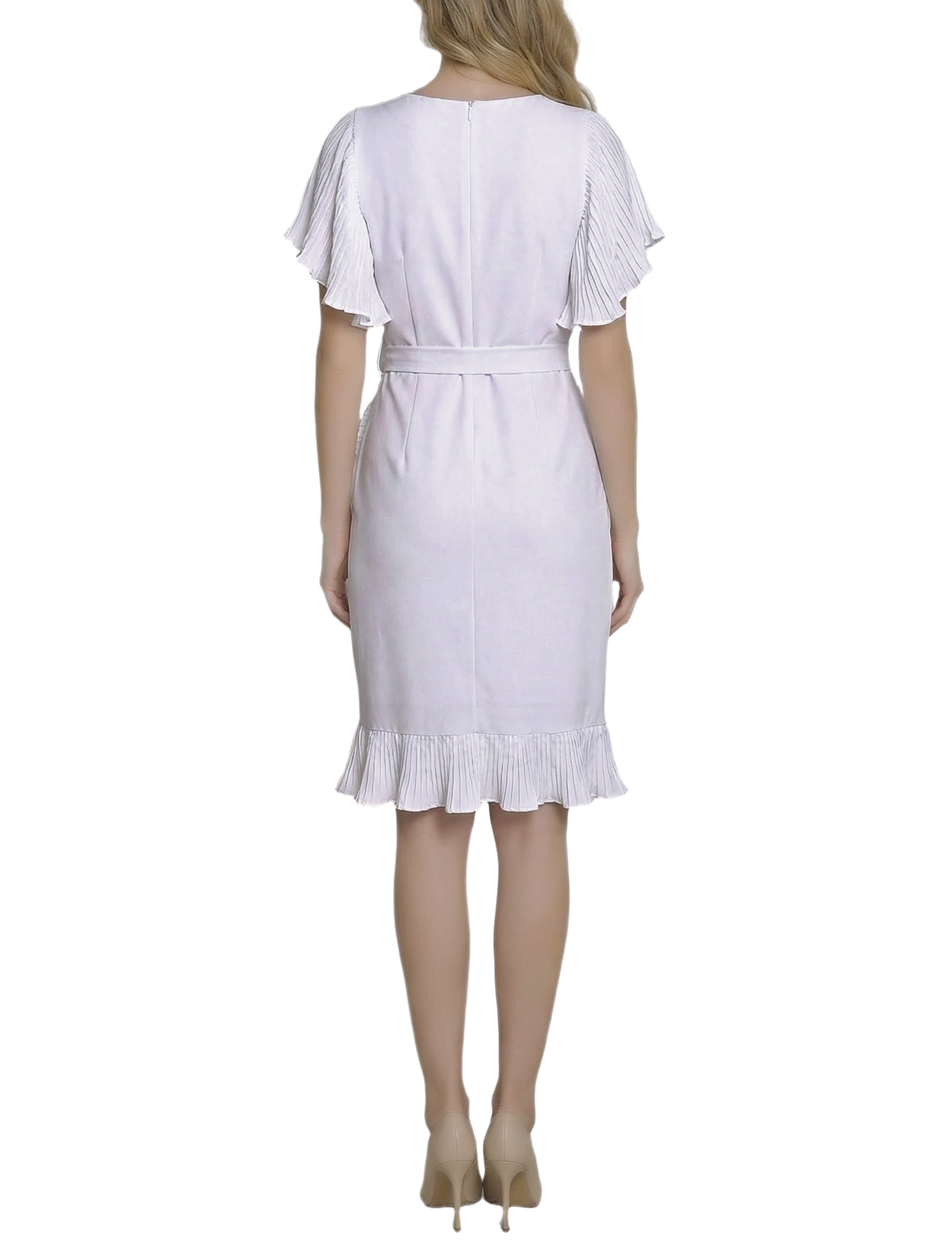This elegant dress from NY Collection features a flattering knee-length silhouette with flutter sleeves and a softly draped wrap-style skirt. Delicate ruffle detailing along the hem and side tie adds movement and a feminine finish, making it perfect for both special occasions and polished everyday wear.