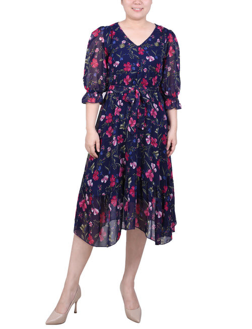 Petite 3/4 Sleeve V-Neck Flounced Dress