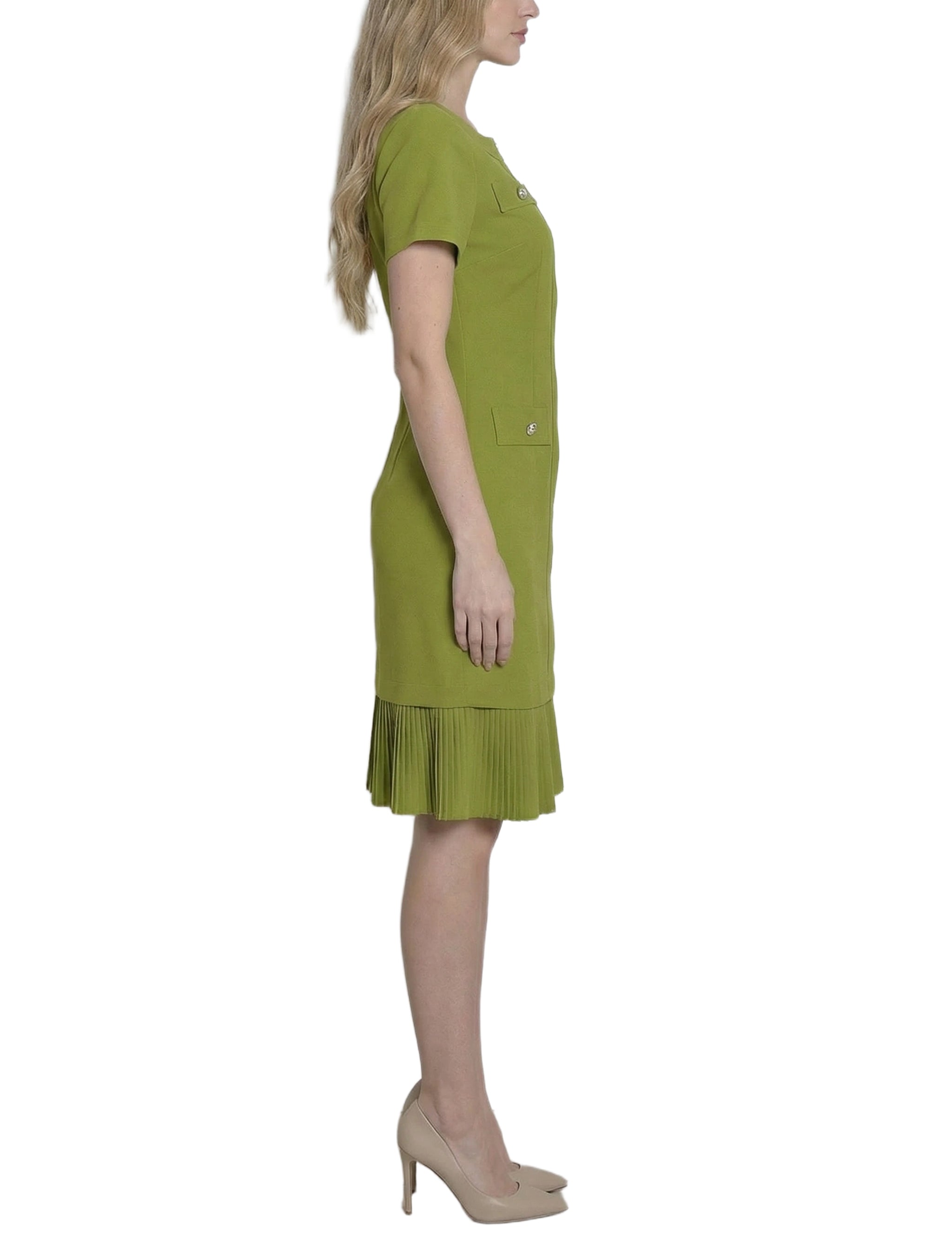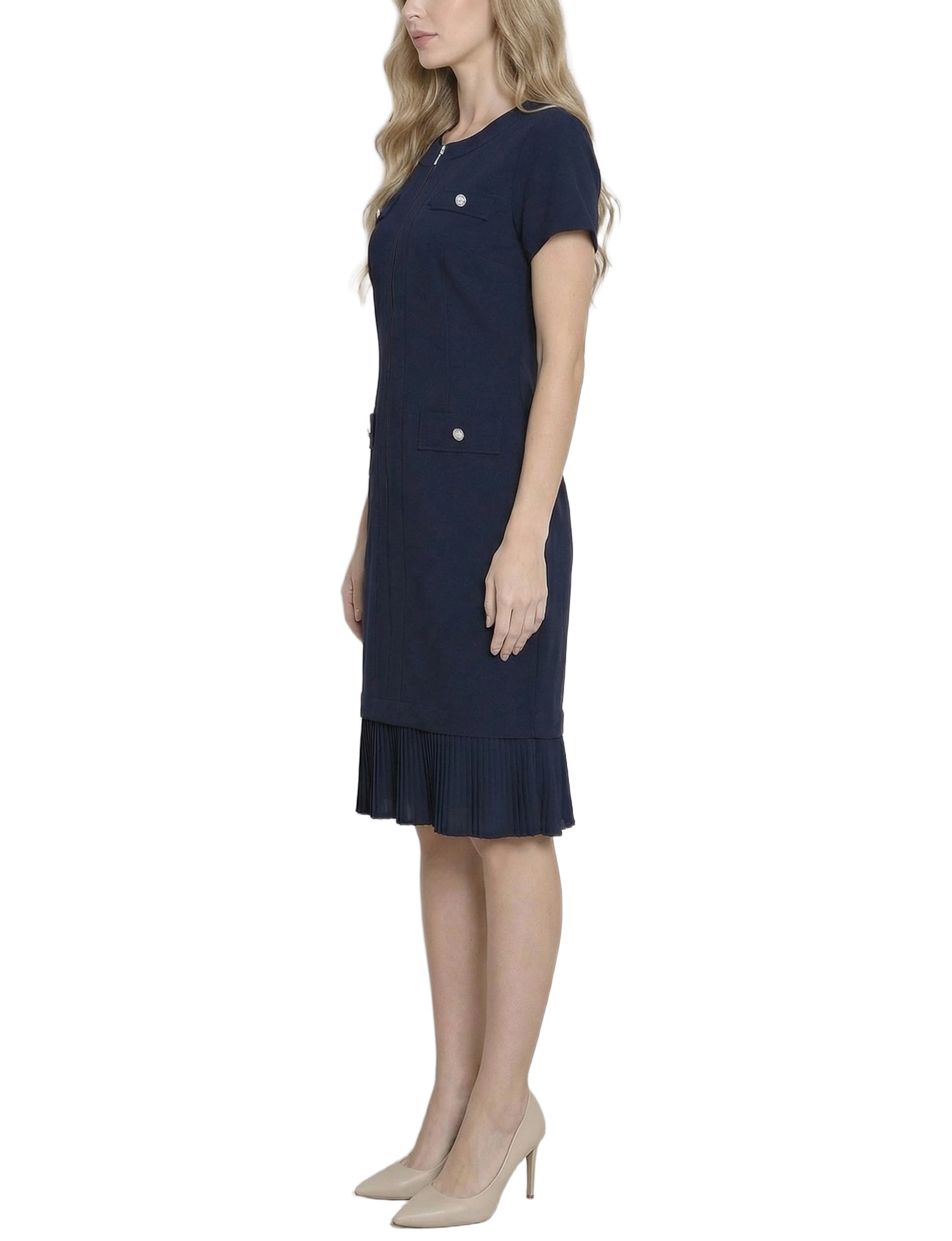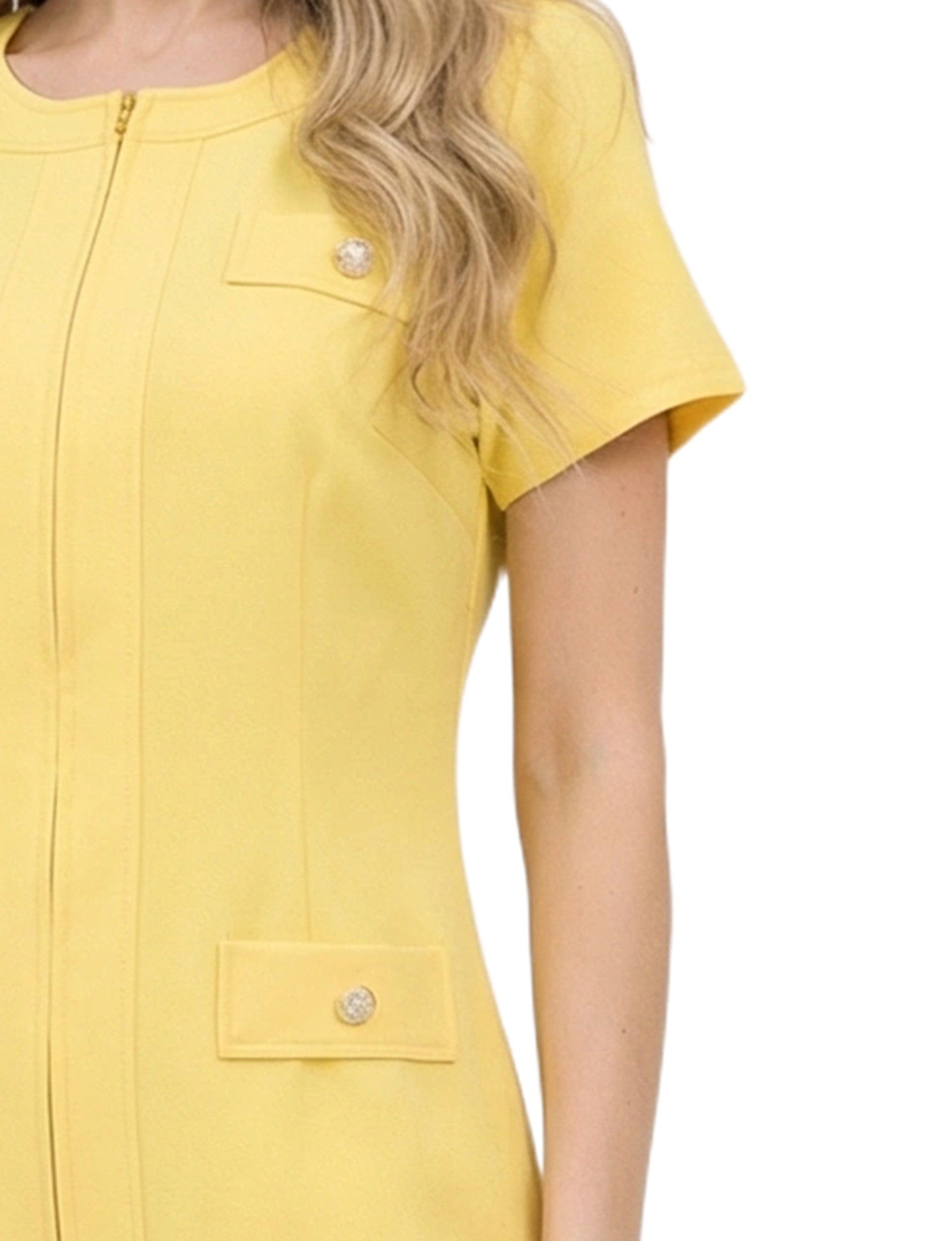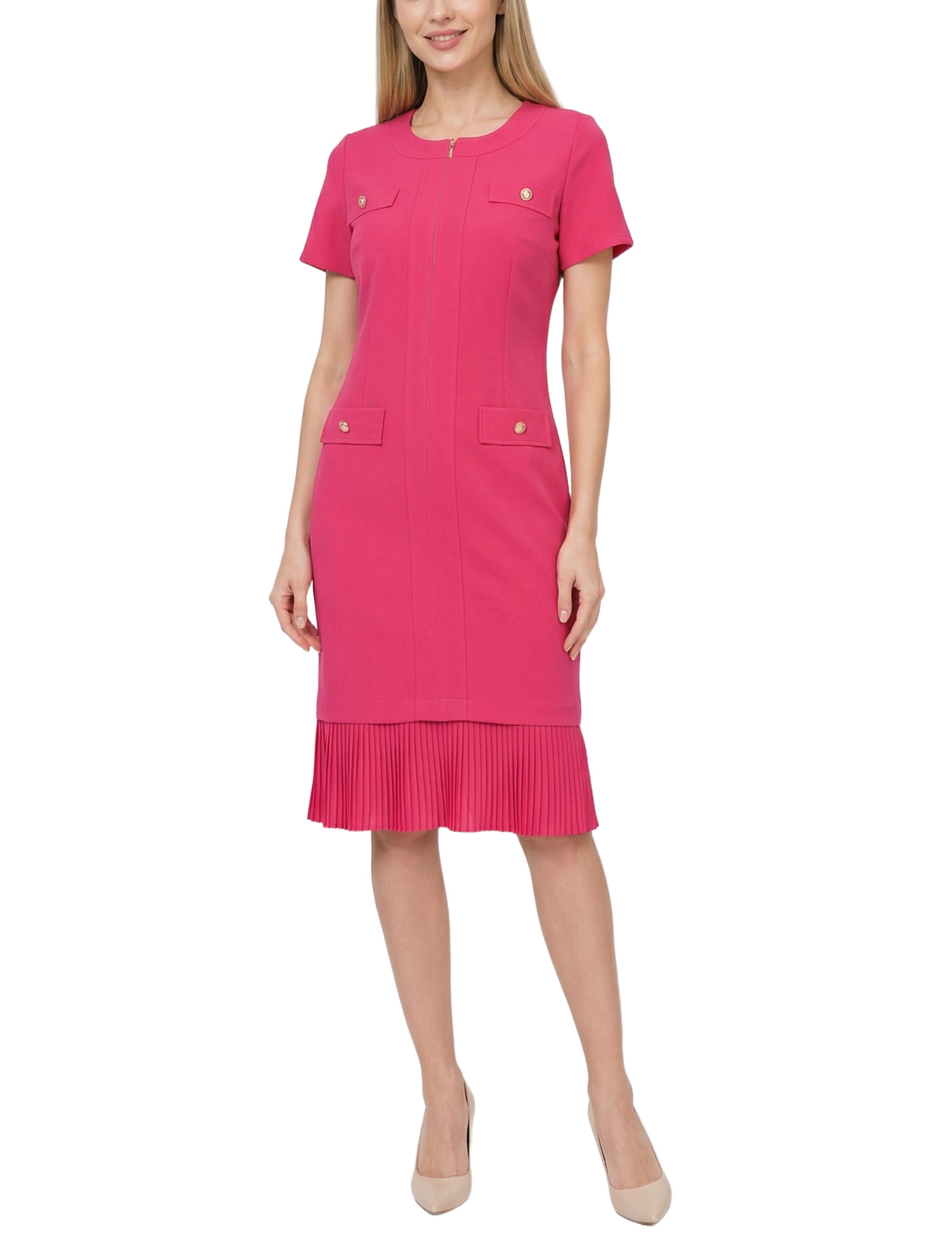 This short-sleeve NY Collection dress features a sleek, tailored silhouette with a front zipper, decorative button accents, and flap pockets for a polished look. Finished with a pleated hem for subtle movement, it’s perfect for workdays or bright, confident daytime outings.
