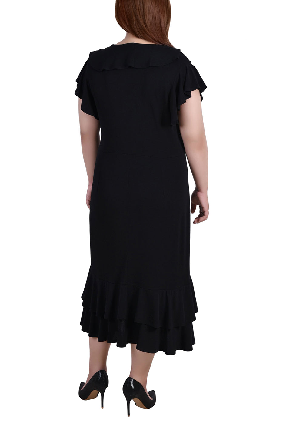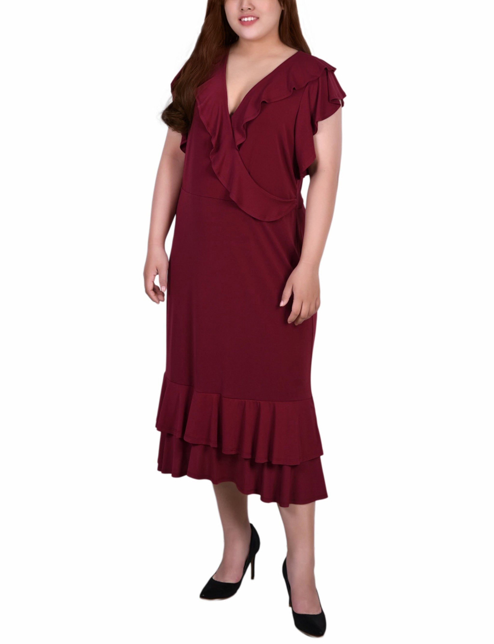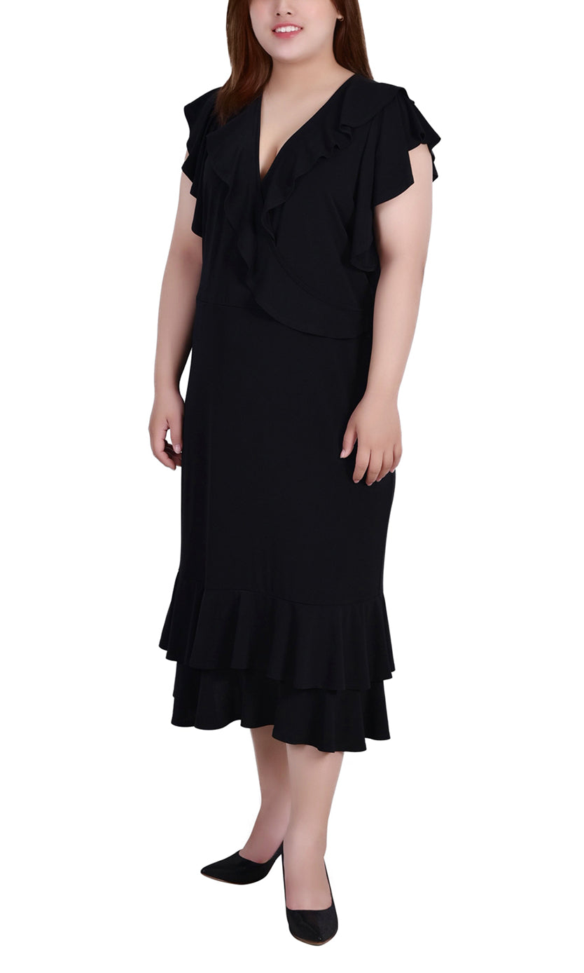 Really make an entrance in this flutter sleeve ruffled crepe dress from NY Collection.