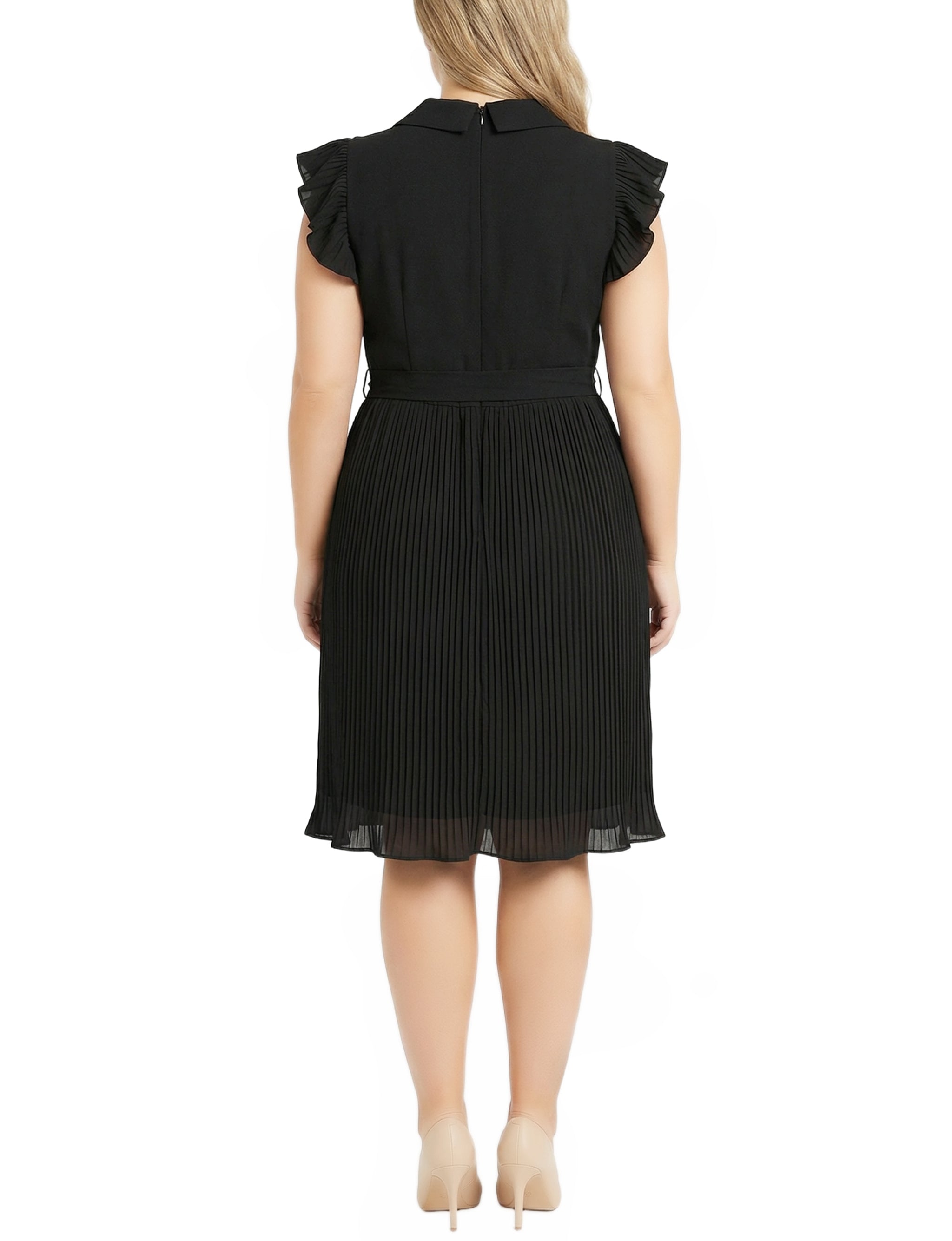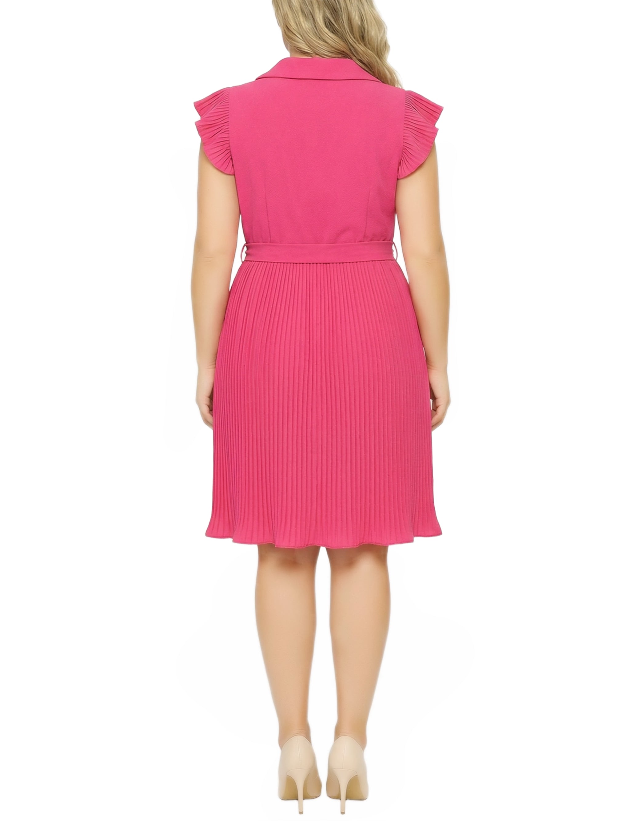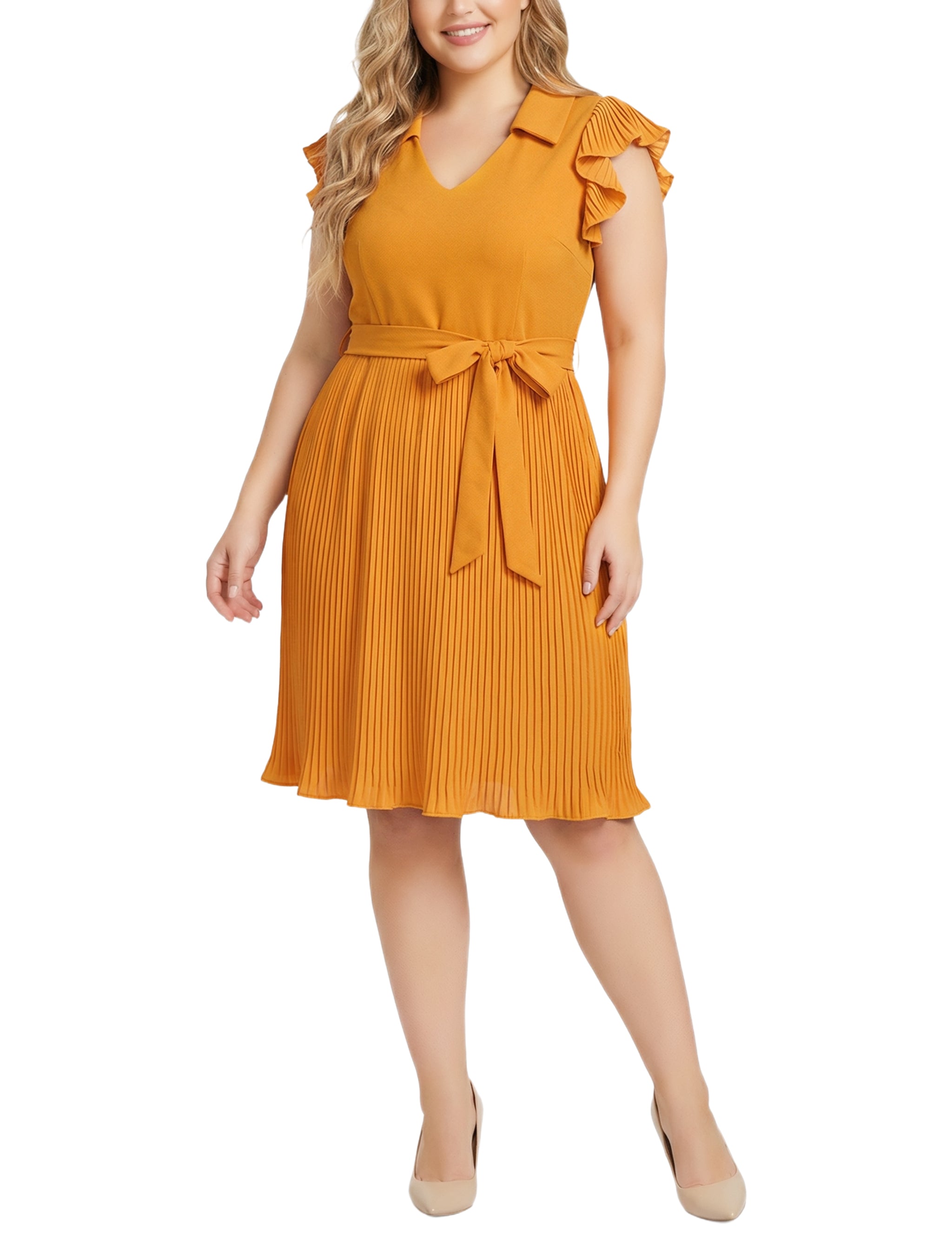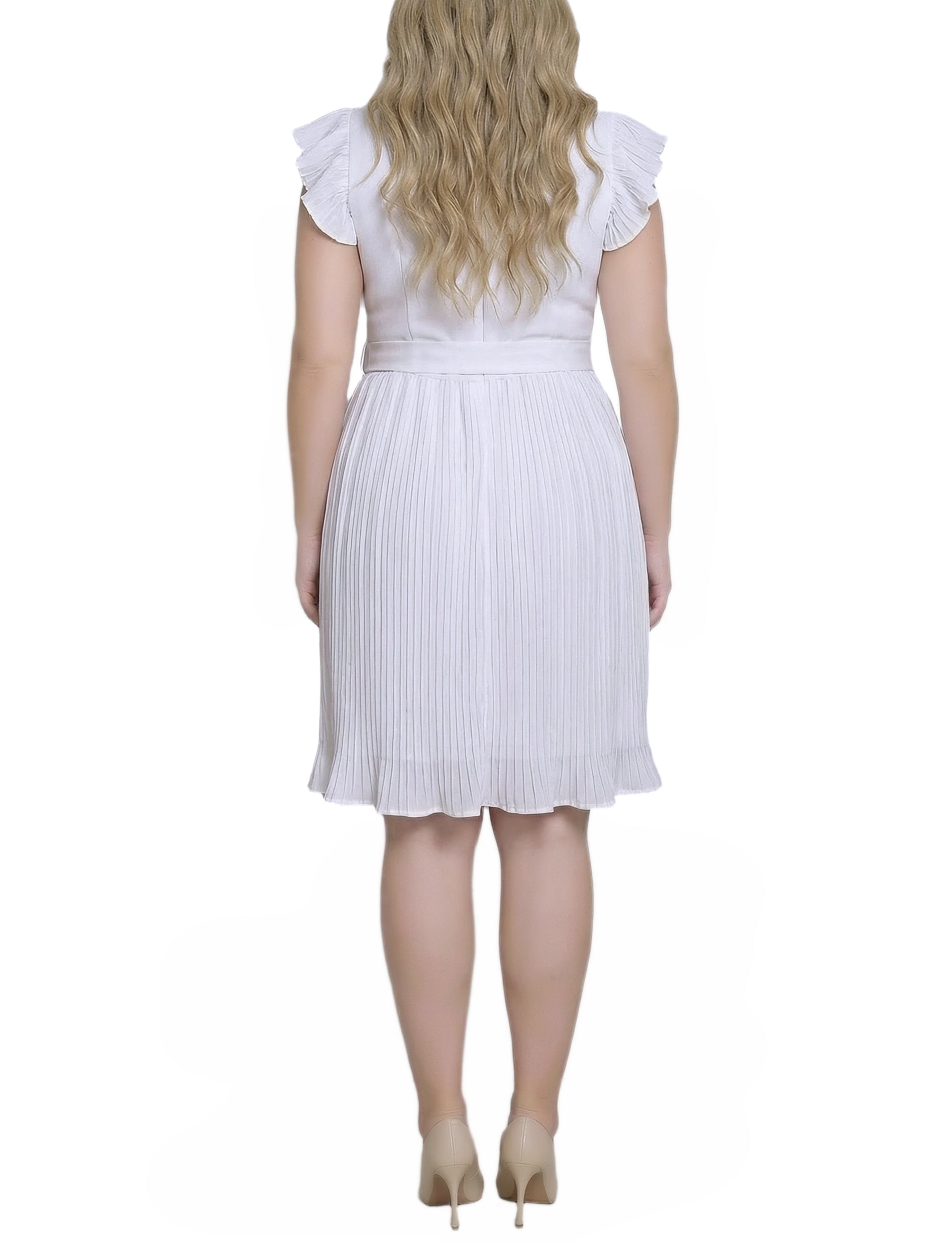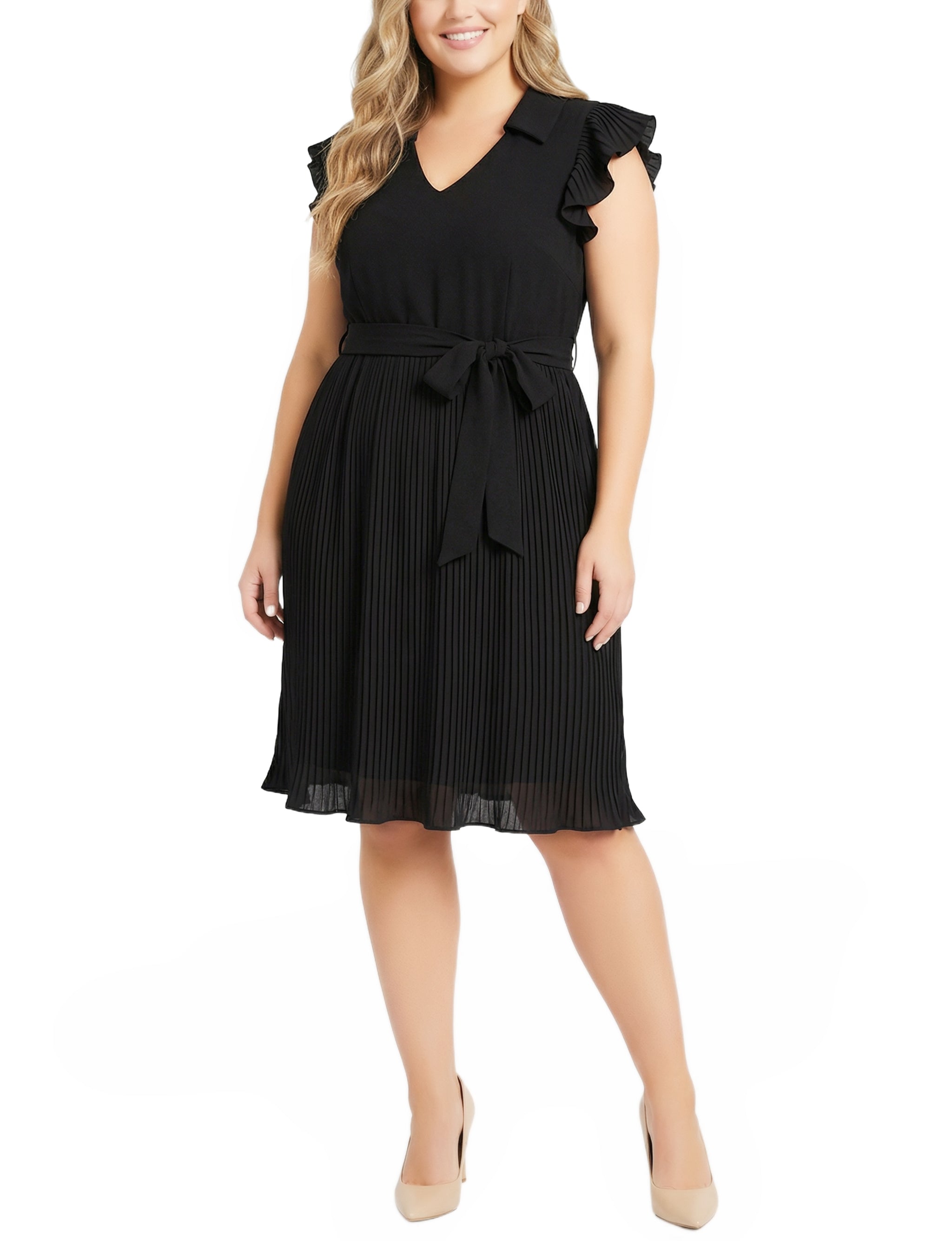 This feminine dress from NY Collection features a flattering V-neckline, pleated cap sleeves, and a softly pleated skirt for graceful movement. A self-tie waist defines the silhouette while the midi length makes it ideal for both daytime events and dressier occasions.