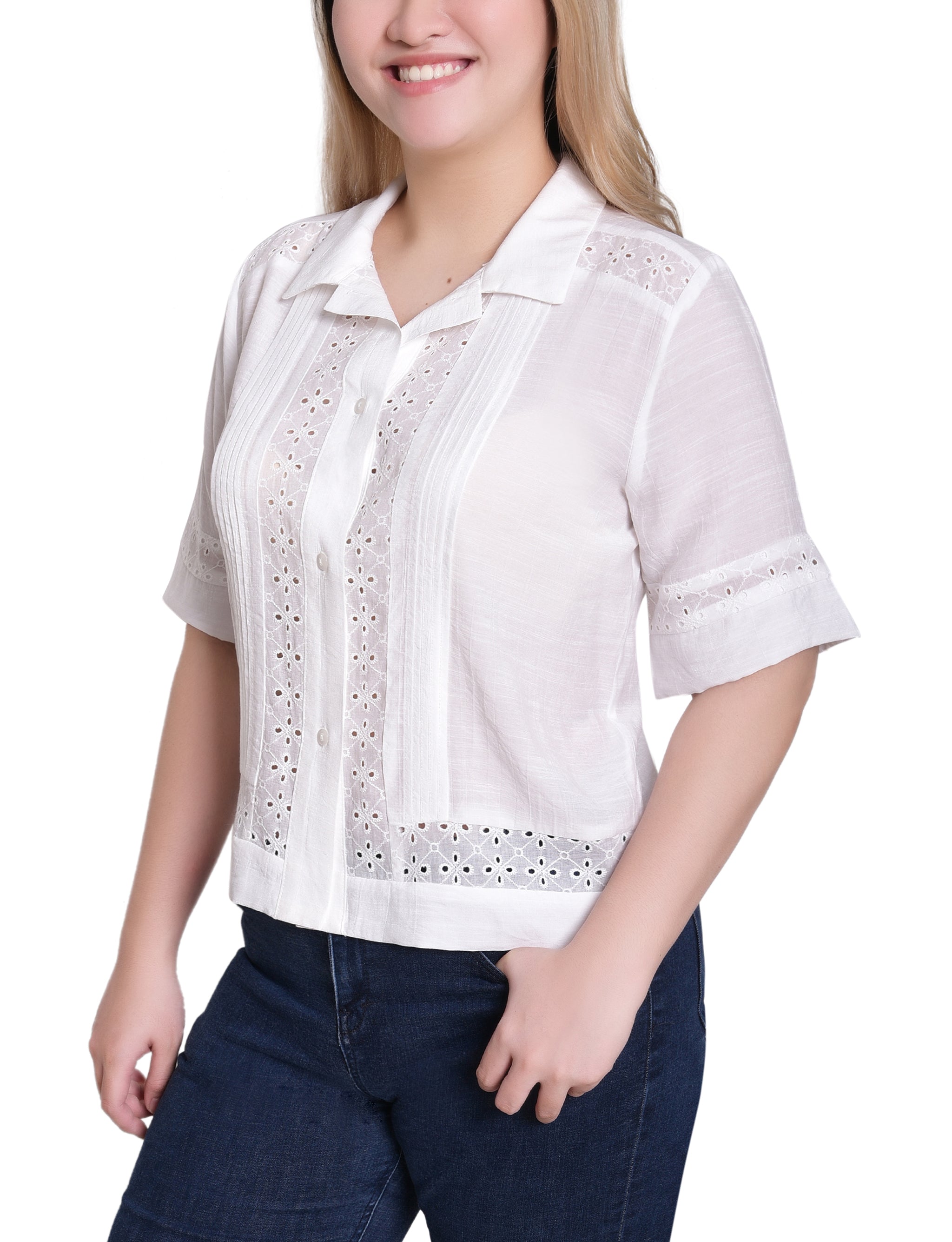 Fresh and feminine, this NY Collection short-sleeve button-up blouse features intricate eyelet embroidery and pintuck details for a breezy, polished look.