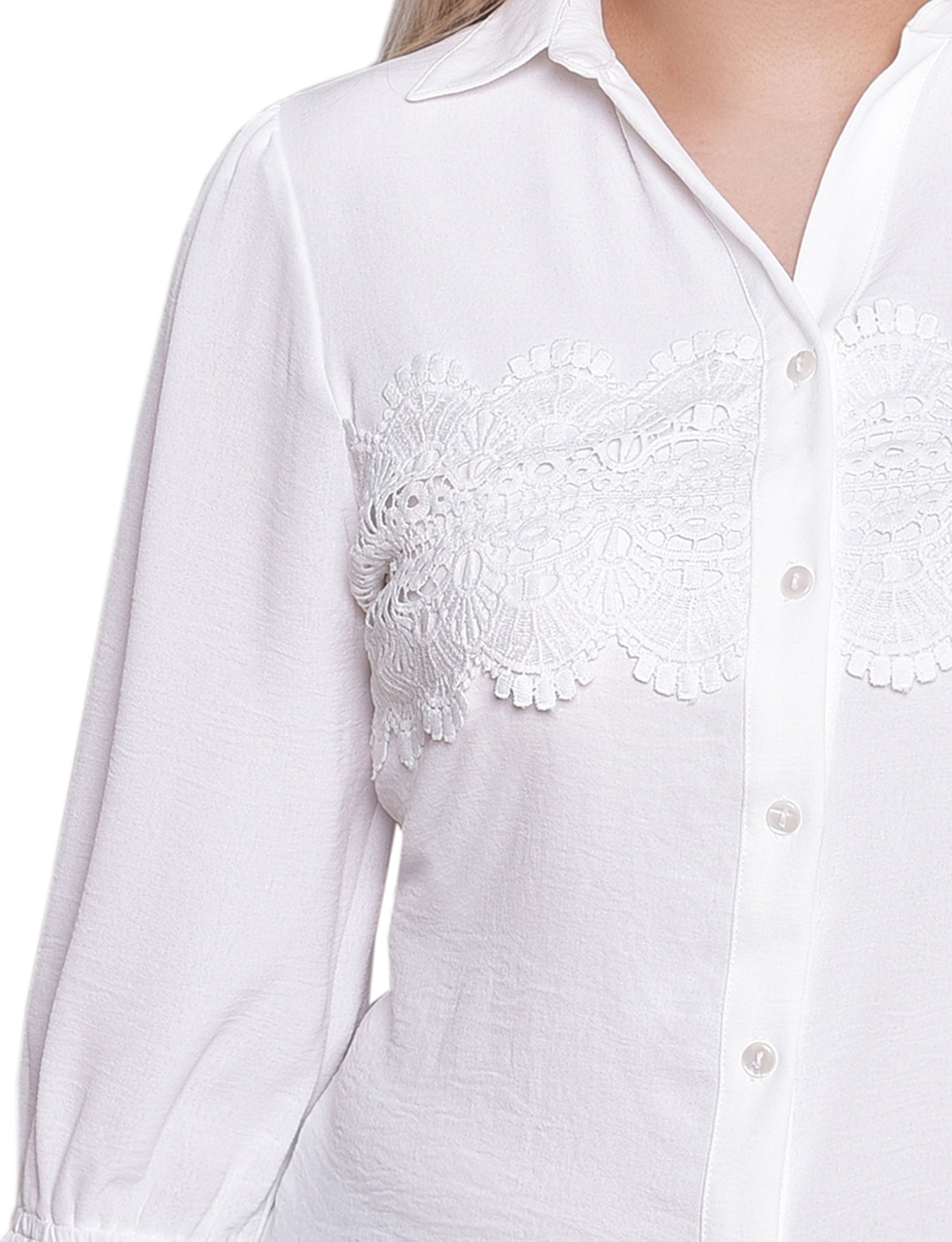 Feminine and fresh, this crisp white blouse from NY Collection features delicate lace detailing across the bodice and sleeve cuffs. A classic collar and button-down front add polish.