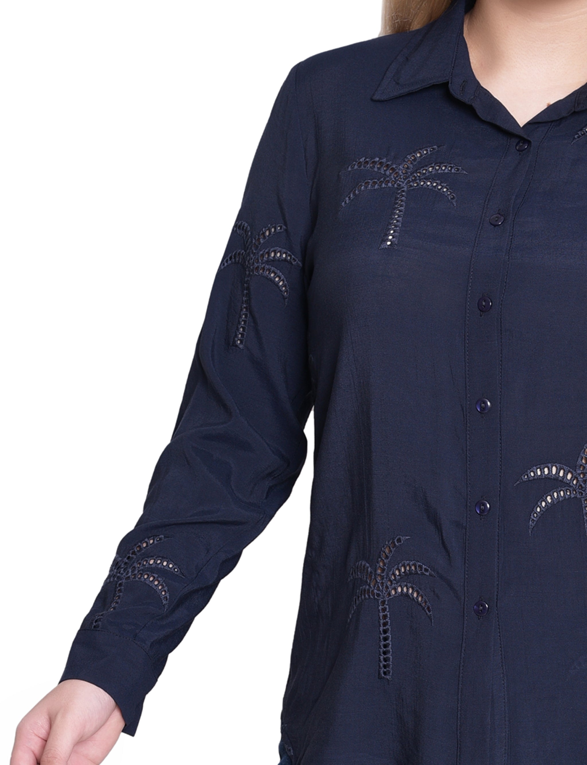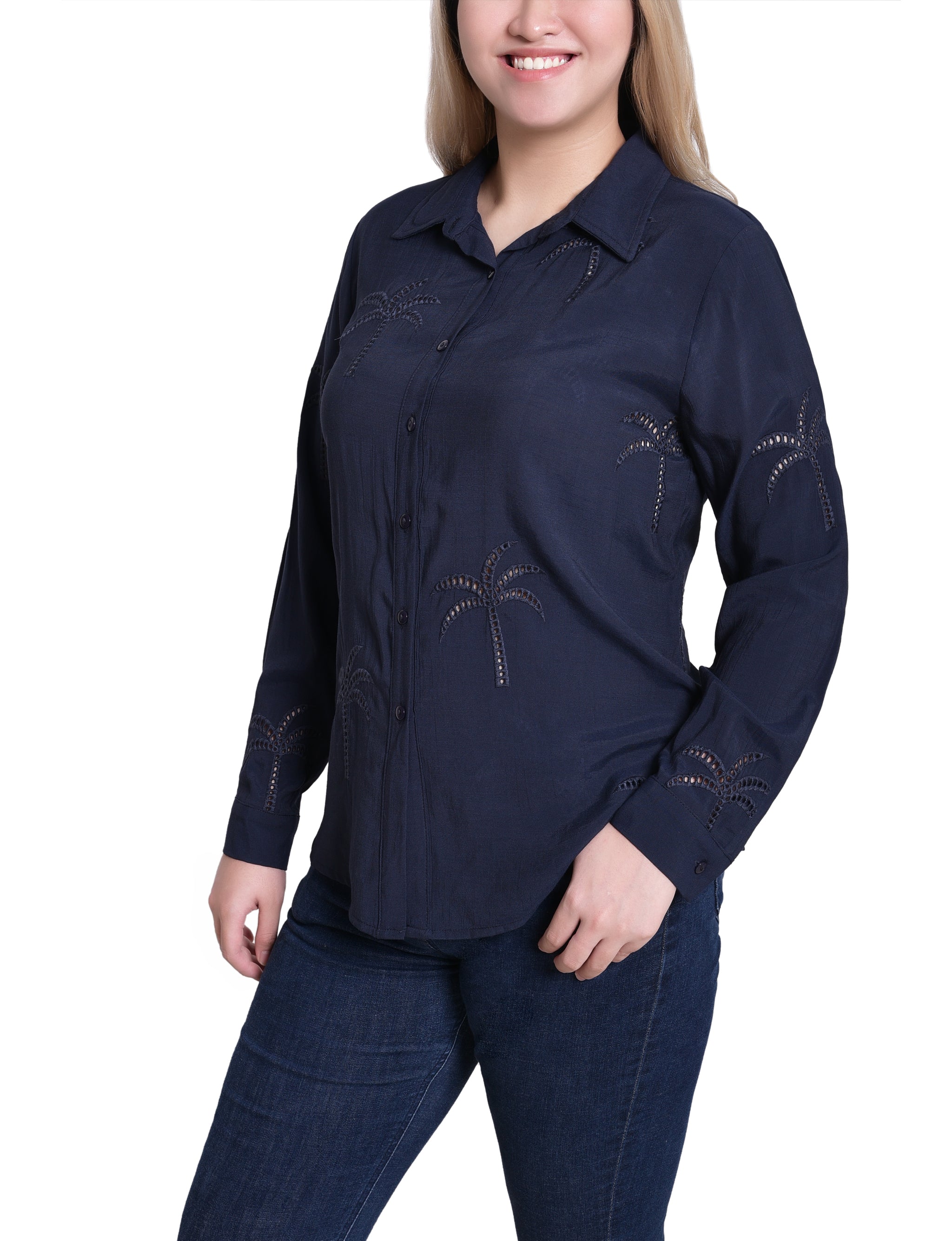 Add a touch of tropical charm to your wardrobe with this NY Collection lightweight button-down blouse. Featuring subtle palm tree embellishments and a relaxed fit, it's perfect for breezy days and effortless style.