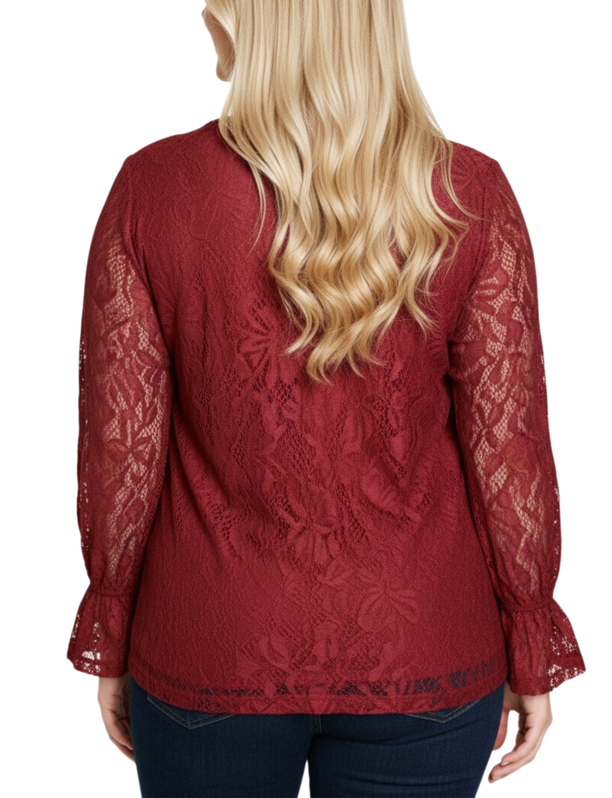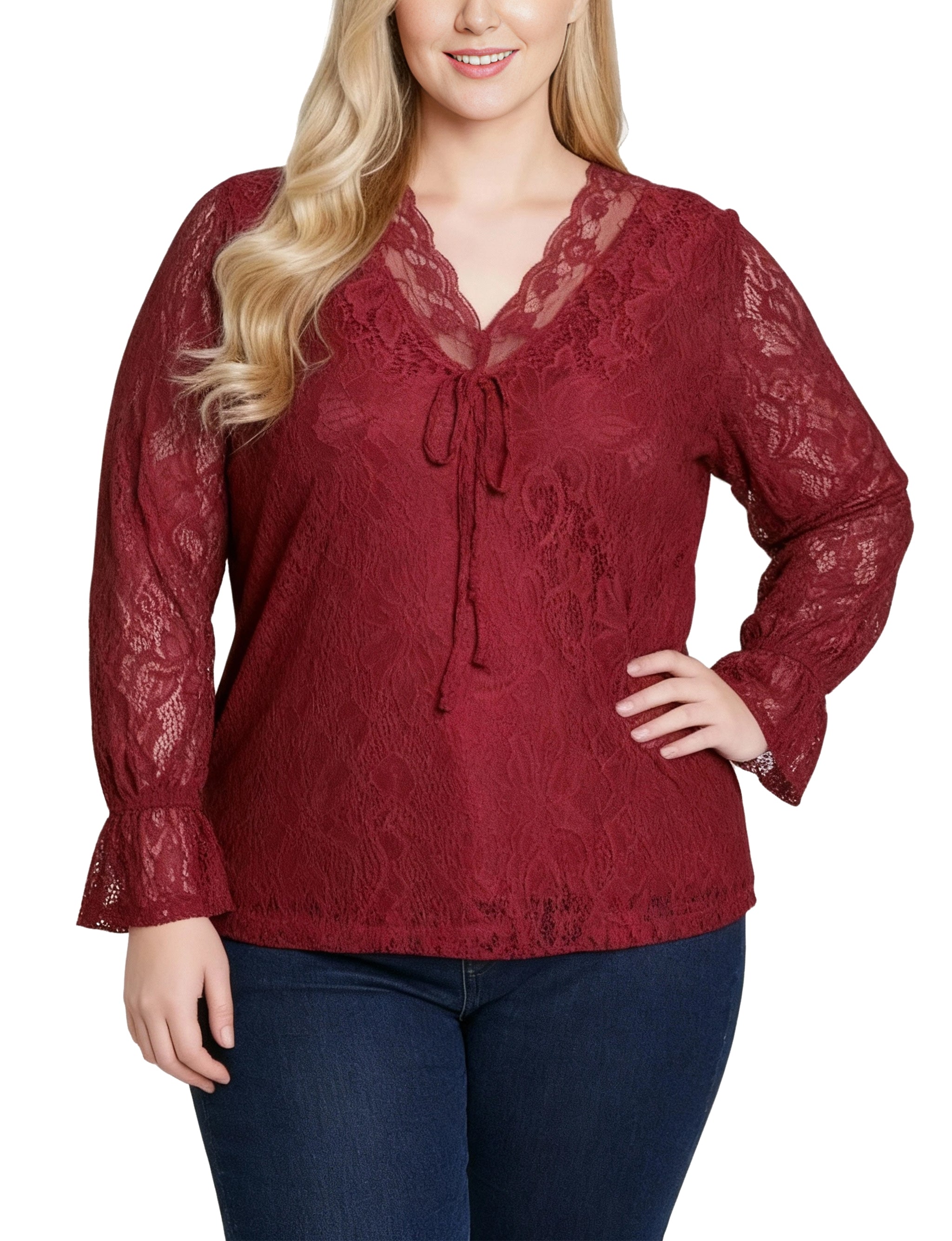 This elegant lace blouse features a delicate floral pattern with a scalloped V-neckline and front tie detail. The lightweight, sheer design and flared sleeves add a touch of feminine charm.
