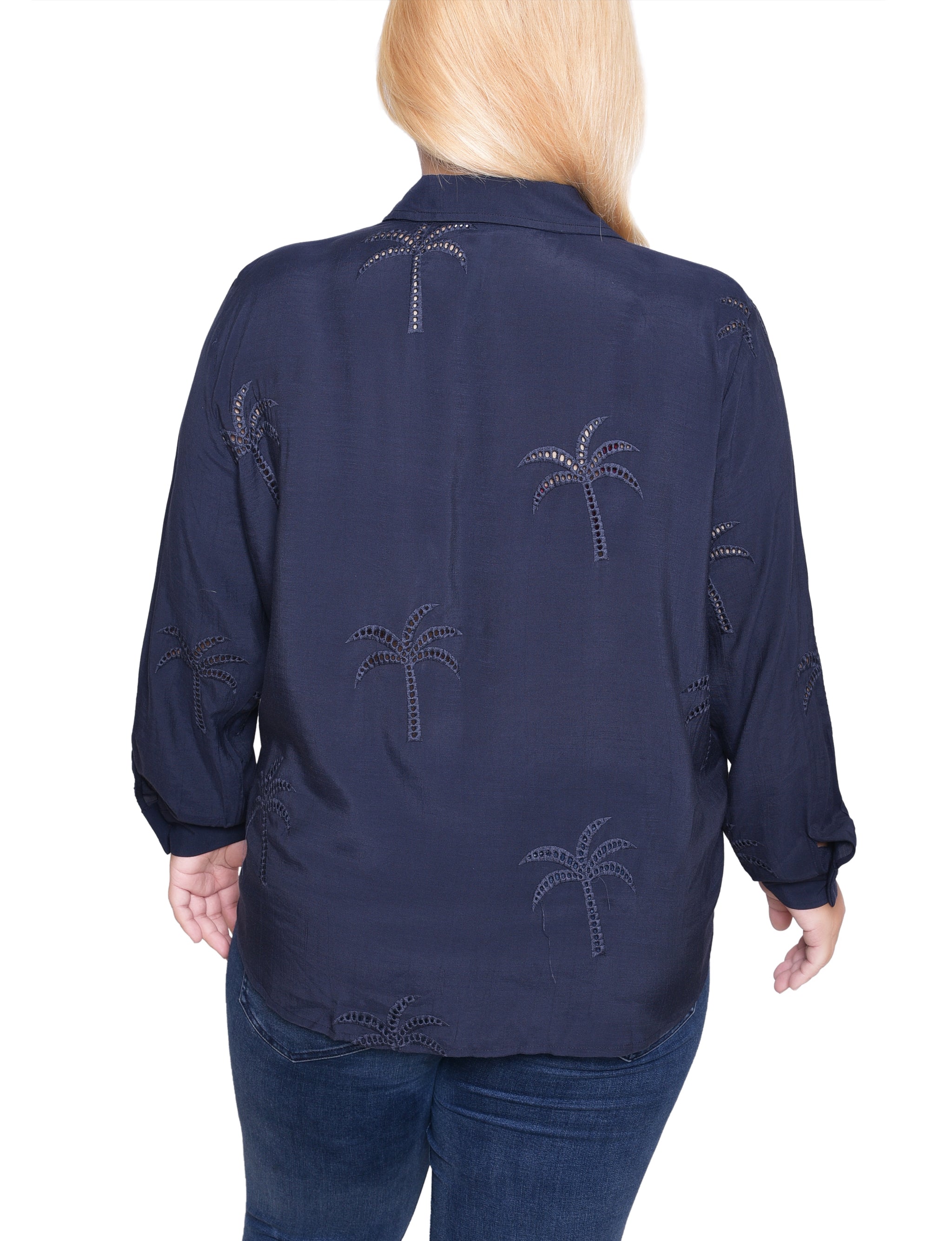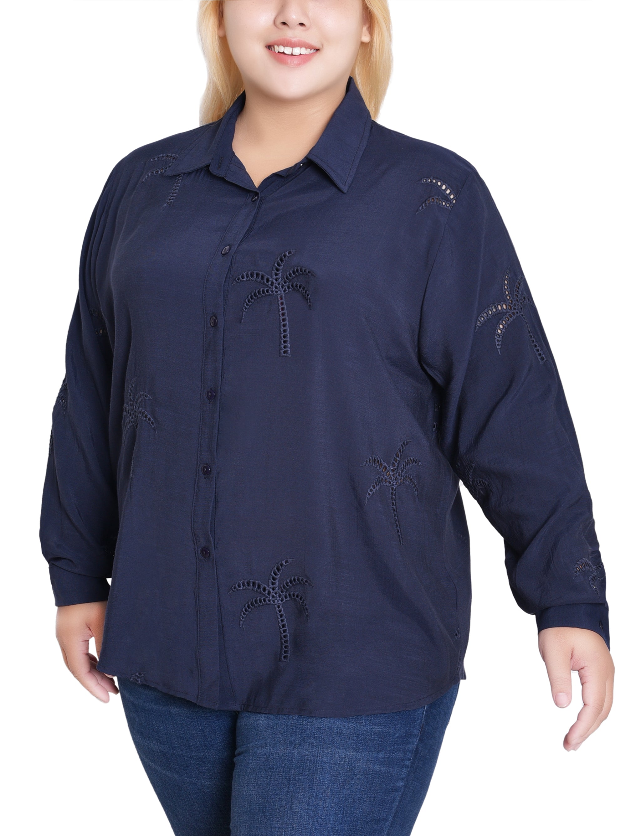 Add a touch of tropical charm to your wardrobe with this NY Collection lightweight button-down blouse. Featuring subtle palm tree embellishments and a relaxed fit, it's perfect for breezy days and effortless style.