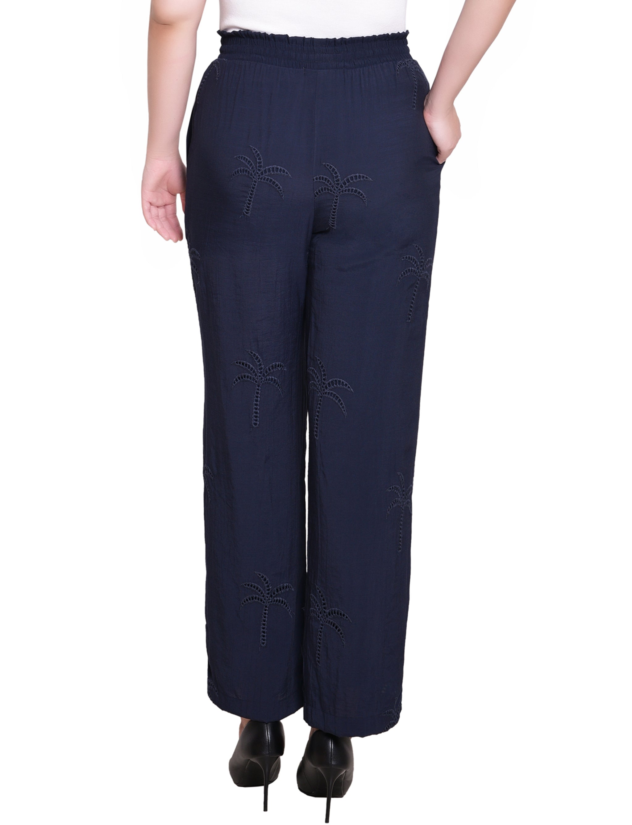 Laid-back yet stylish, these pull-on pants from NY Collection feature subtle palm tree embroidery, an elastic drawstring waist, and relaxed legs—perfect for casual outings or vacation wear.