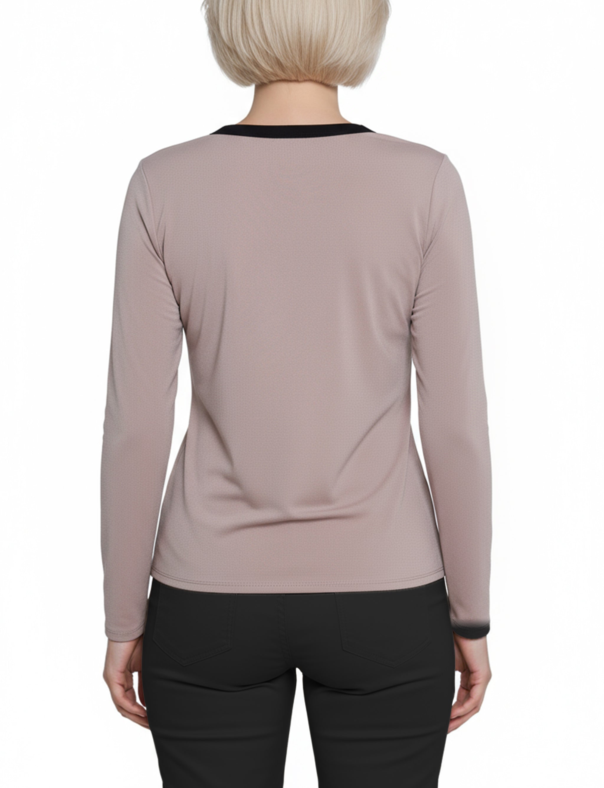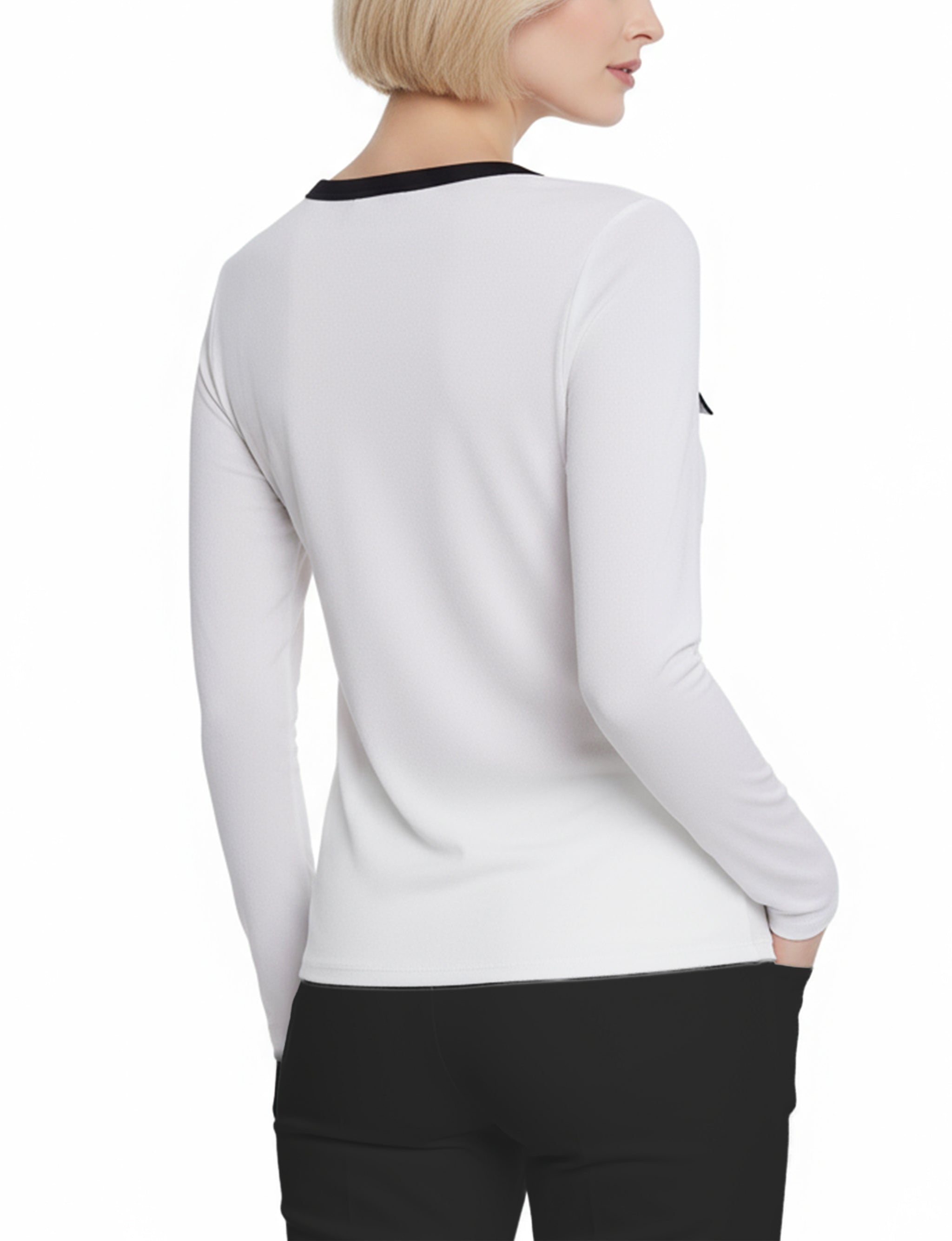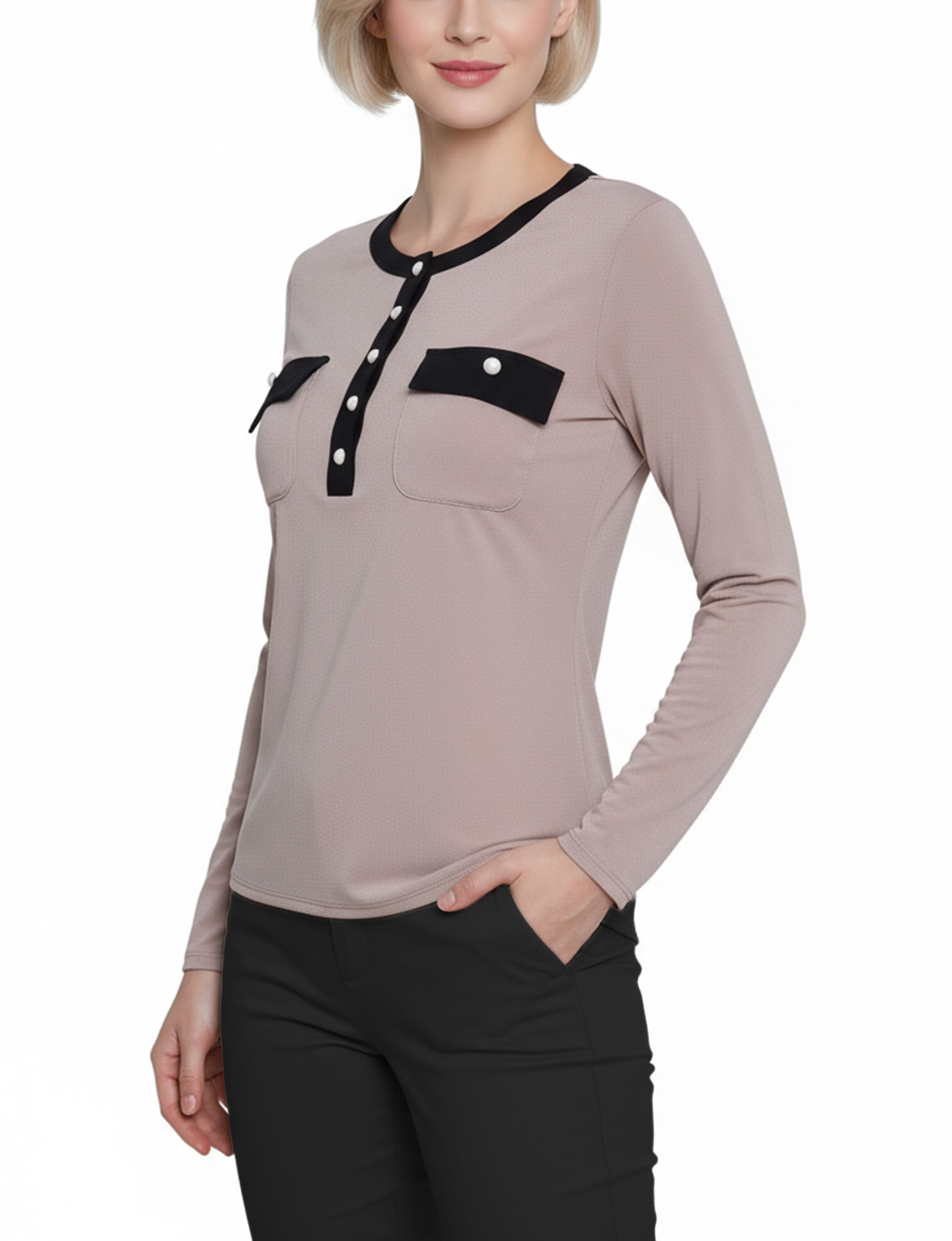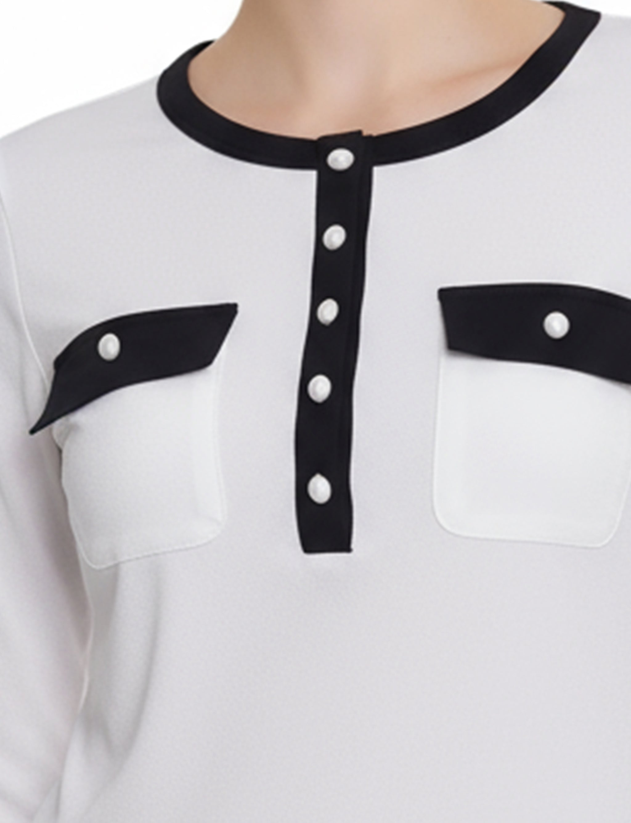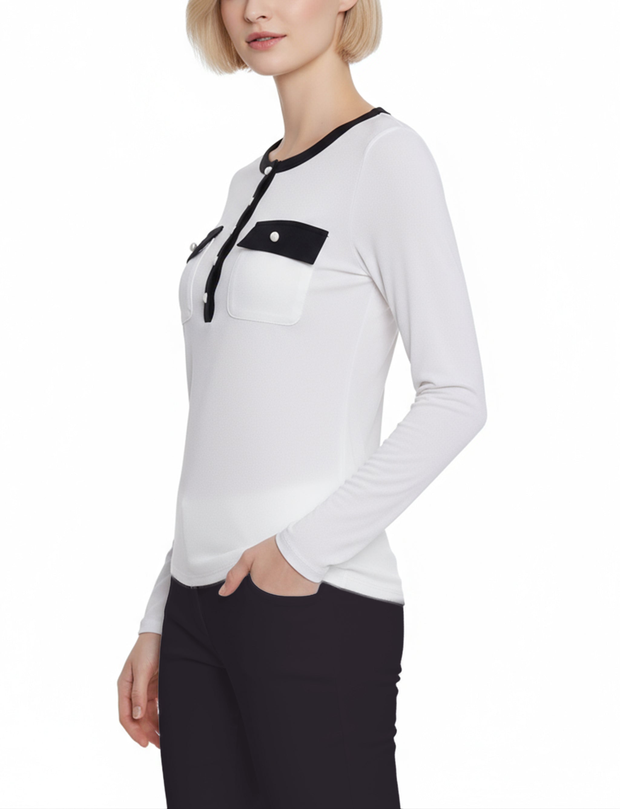 This sleek NY Collection top features bold contrast details on the collar, button placket, and faux pocket flaps for a modern, monochrome look. The long sleeves and tailored fit make it perfect for both workdays and weekends.