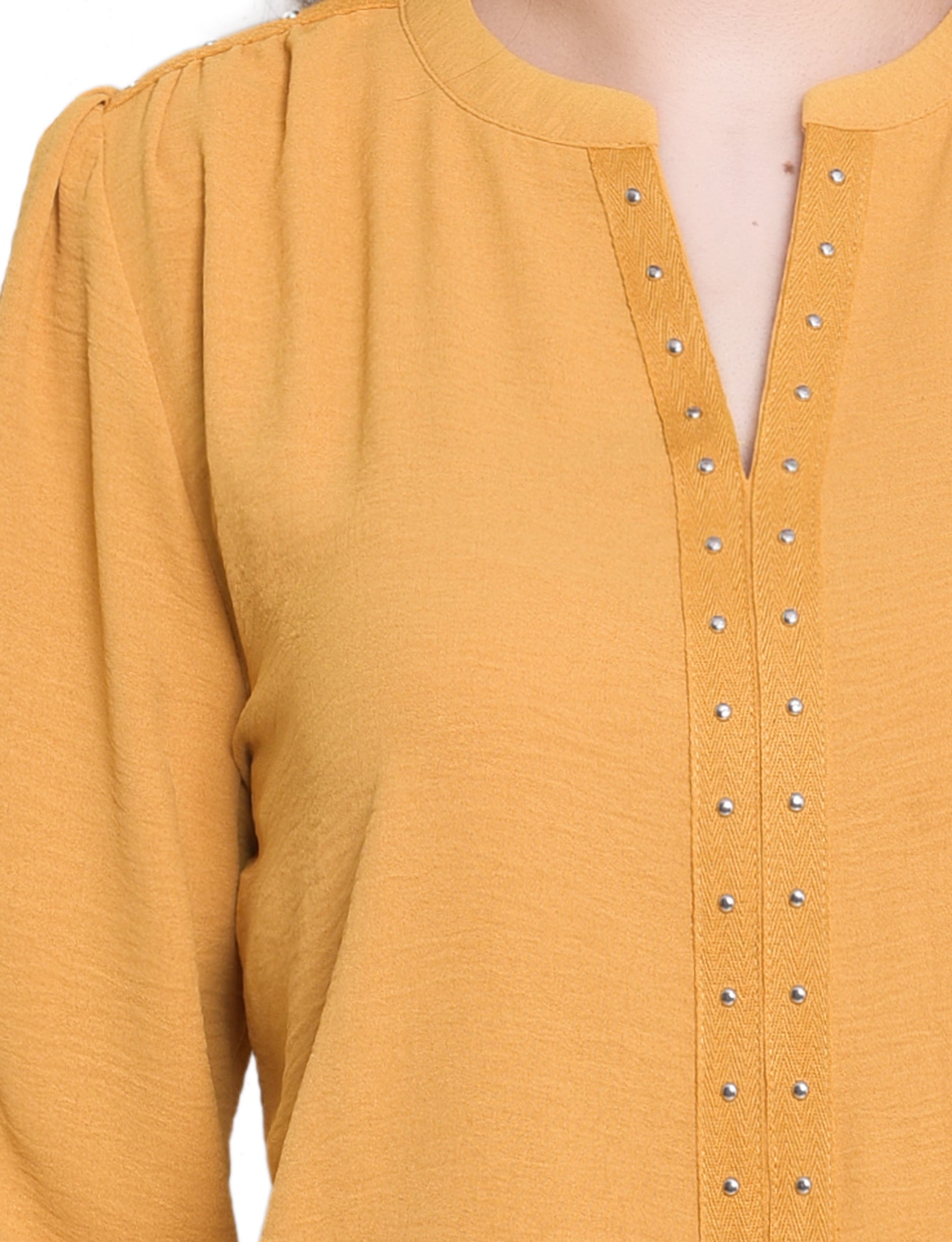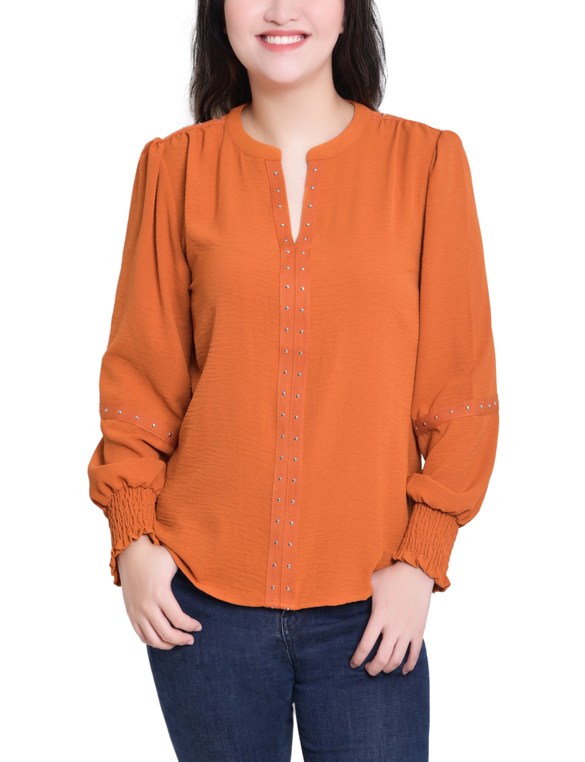 This textured blouse from NY Collection features a deep split neckline accented with metallic stud detailing for a touch of modern edge. Designed with smocked cuffs and relaxed long sleeves, it pairs effortlessly with jeans or trousers for a chic everyday look.