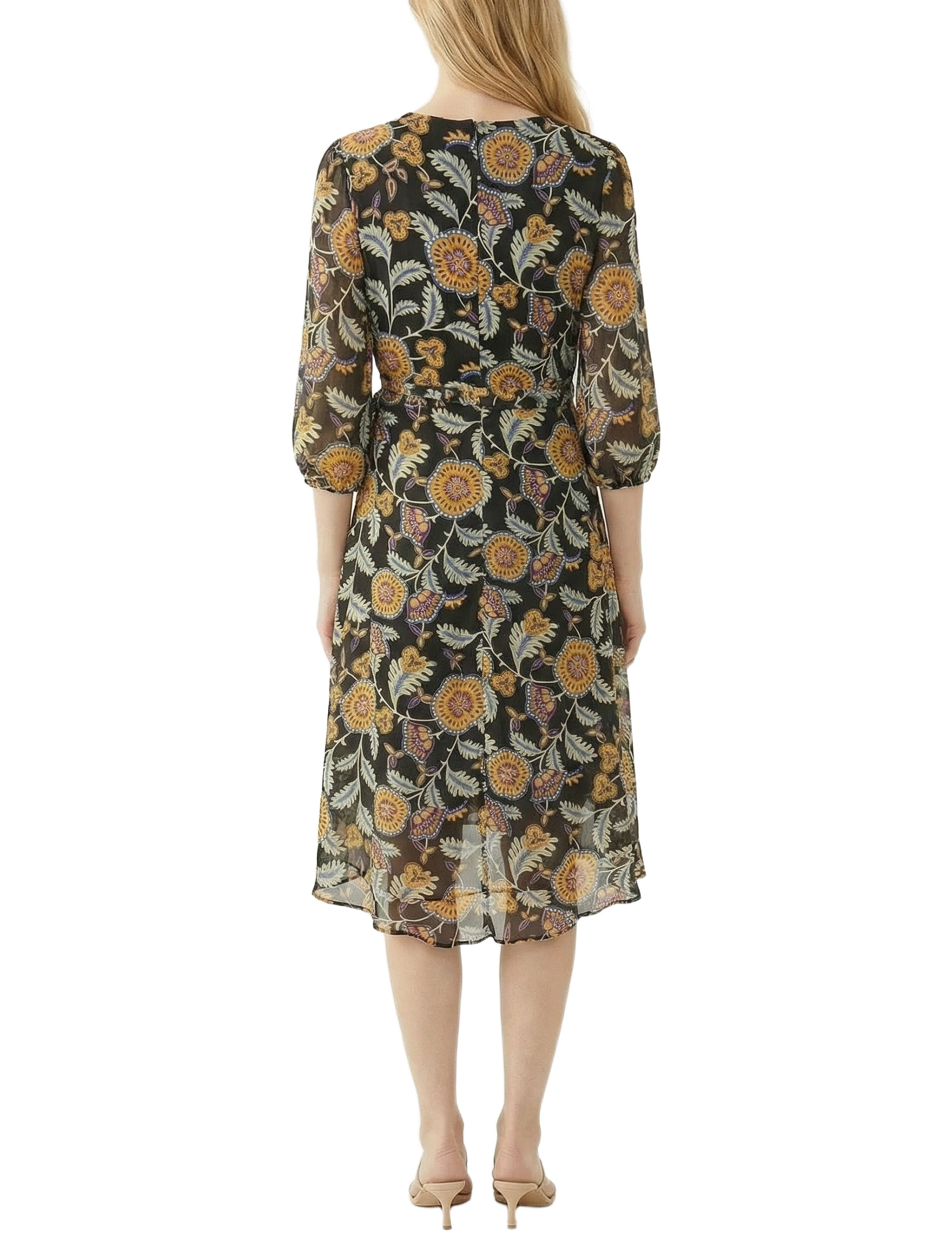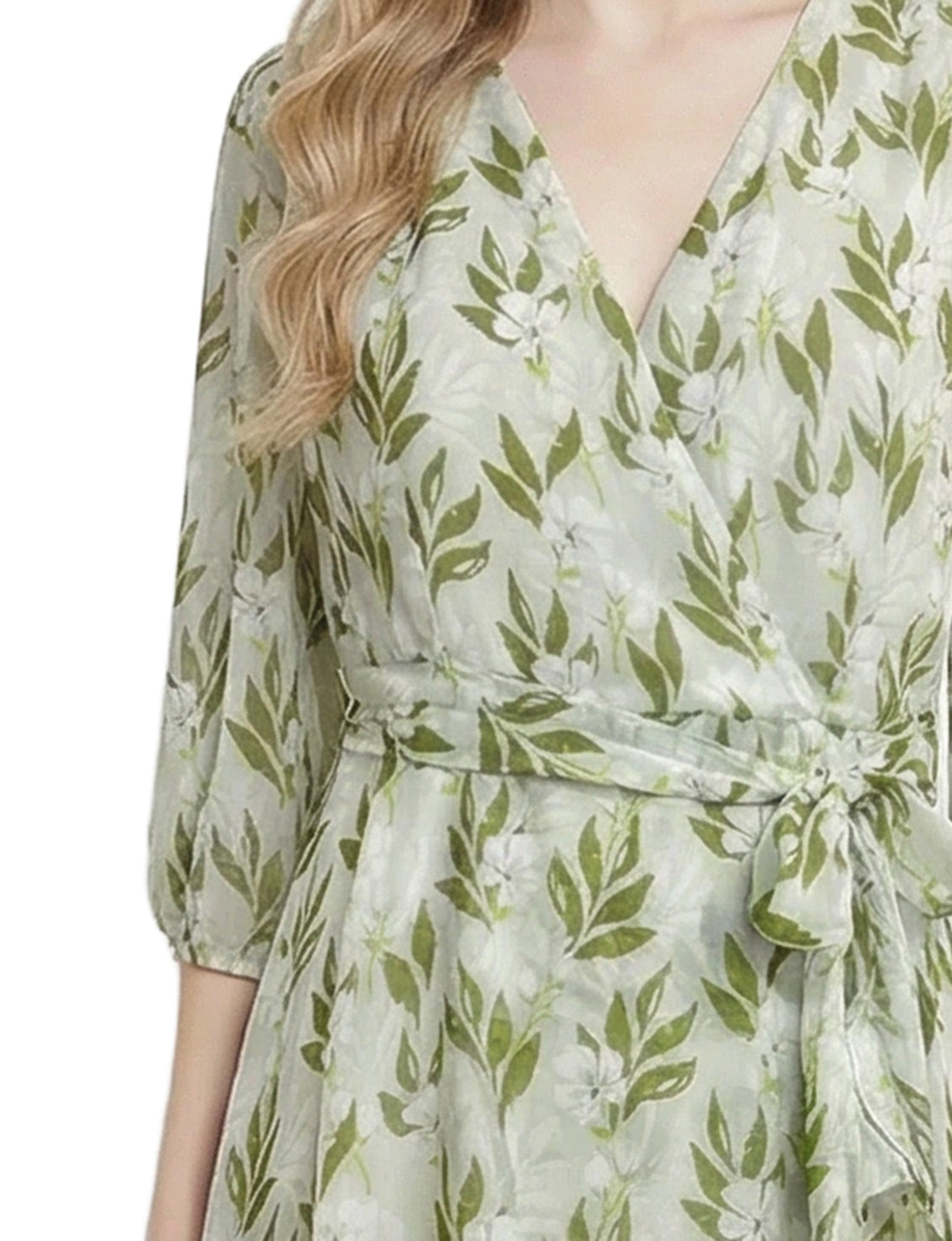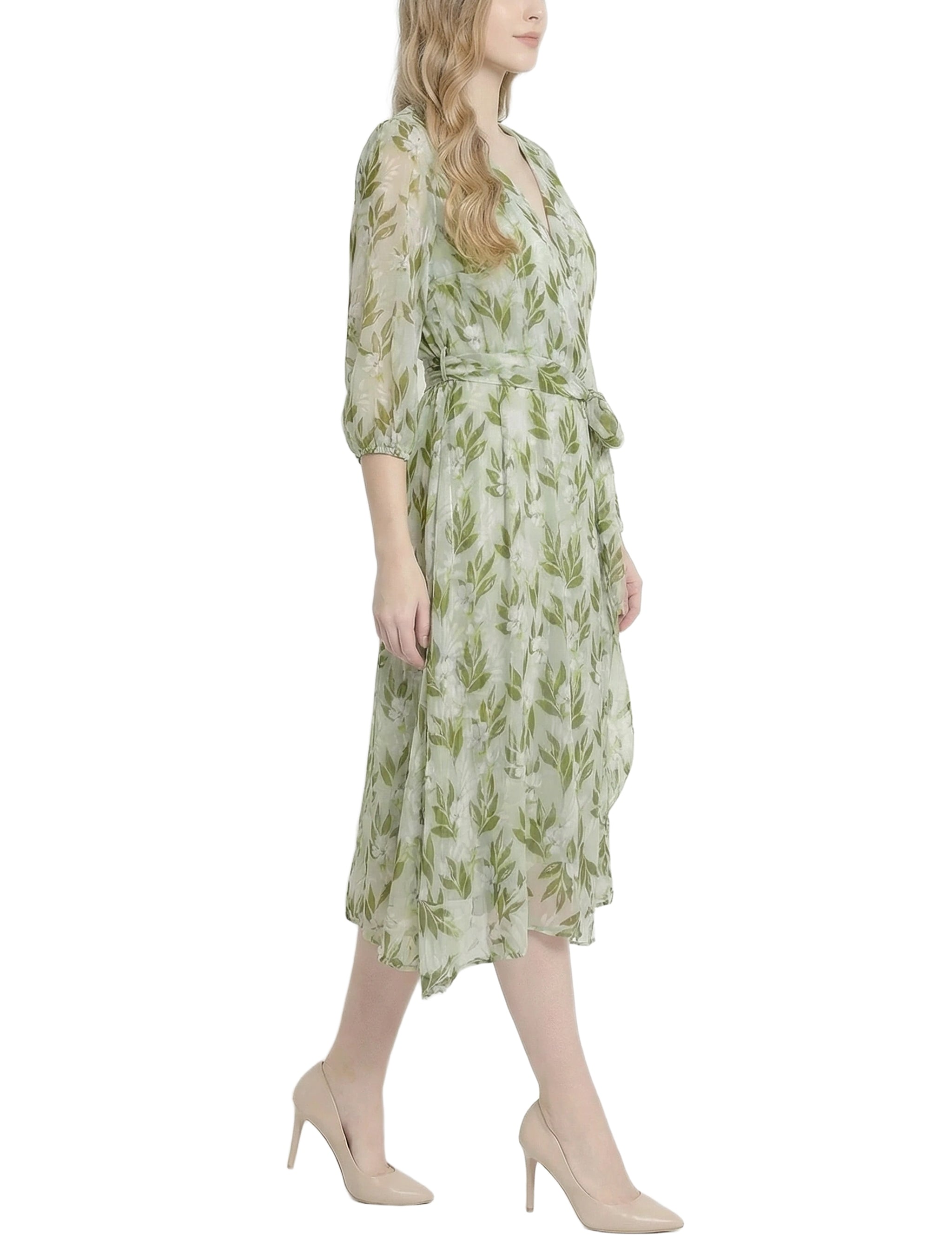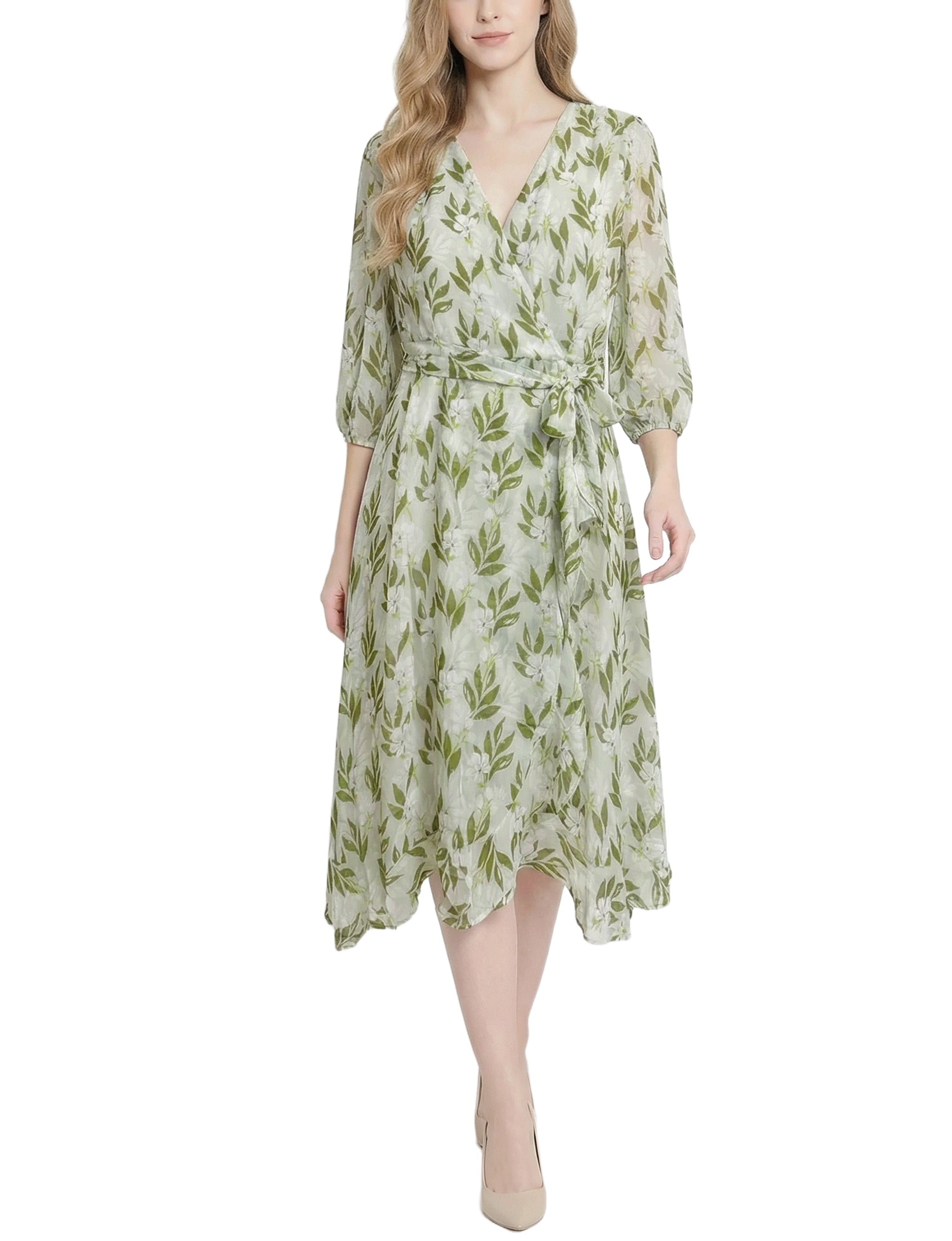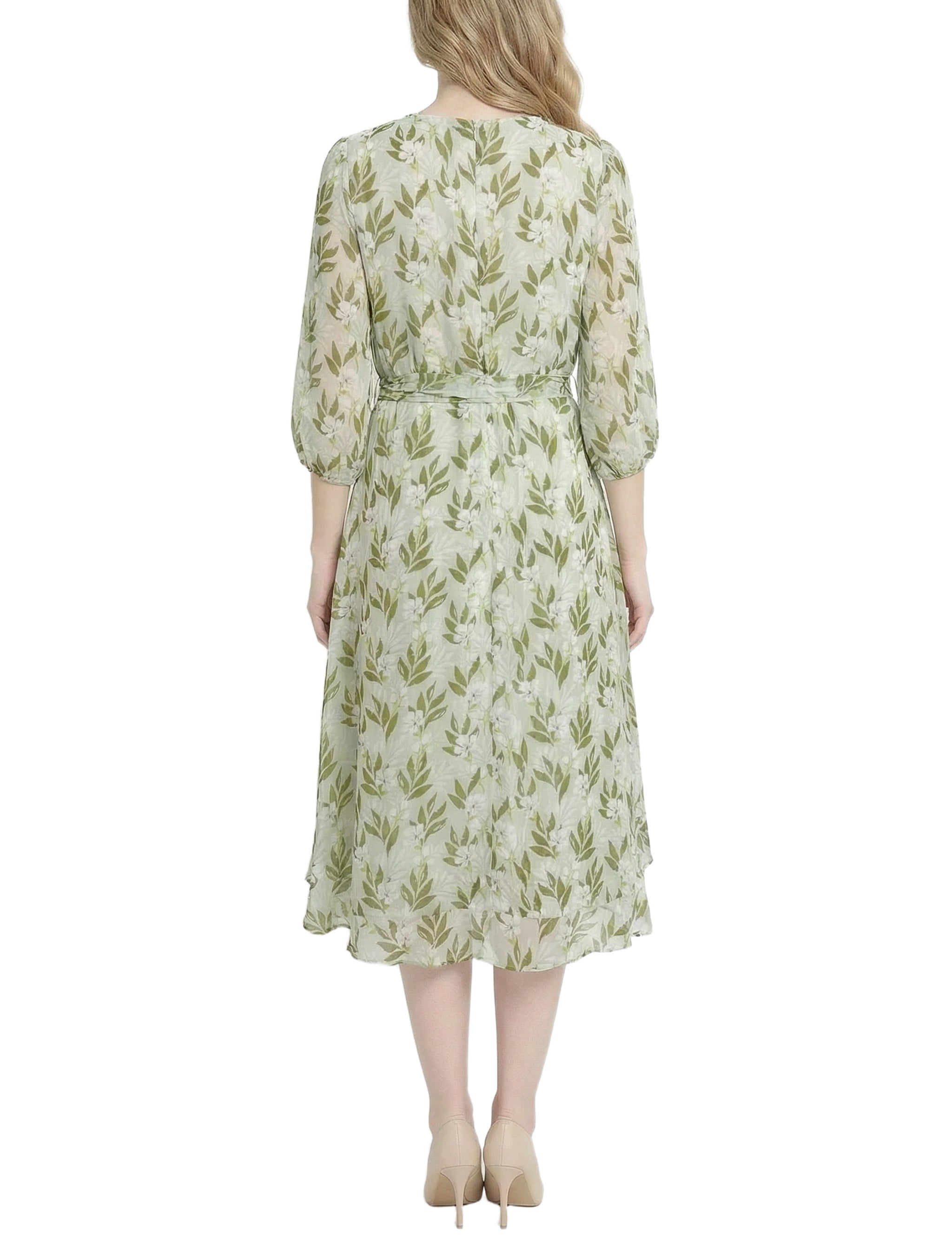 Petite 3/4 Sleeve V Neck Belted Chiffon Dress