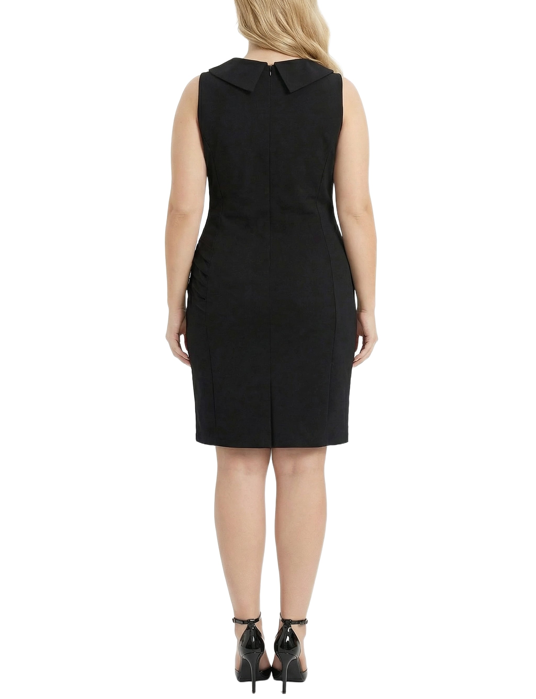 This sleek sleeveless dress from NY Collection features a wide shawl collar and subtle rouching that creates a flattering, streamlined silhouette. Finished with a knee-length hem and polished details, it transitions effortlessly from professional settings to special occasions.