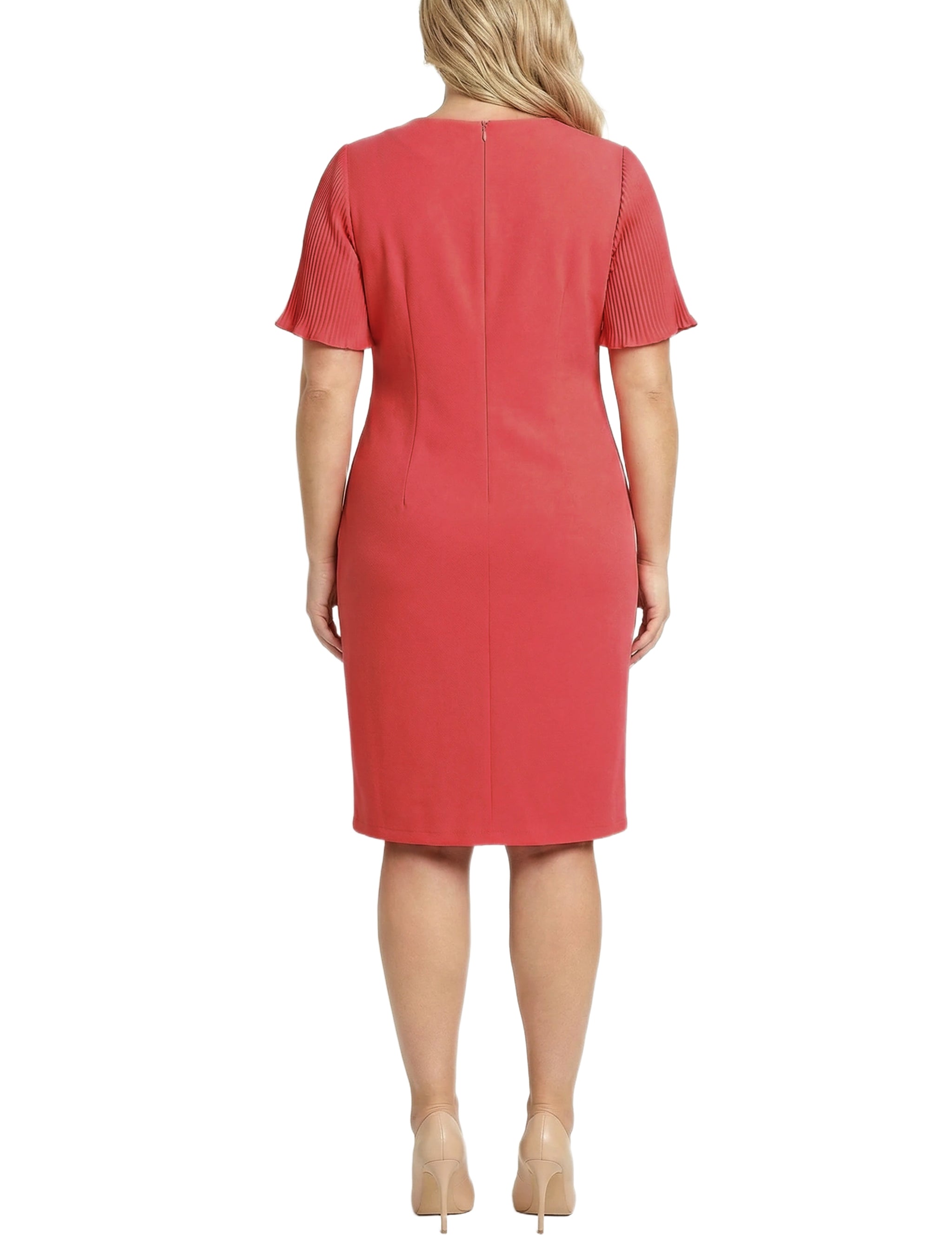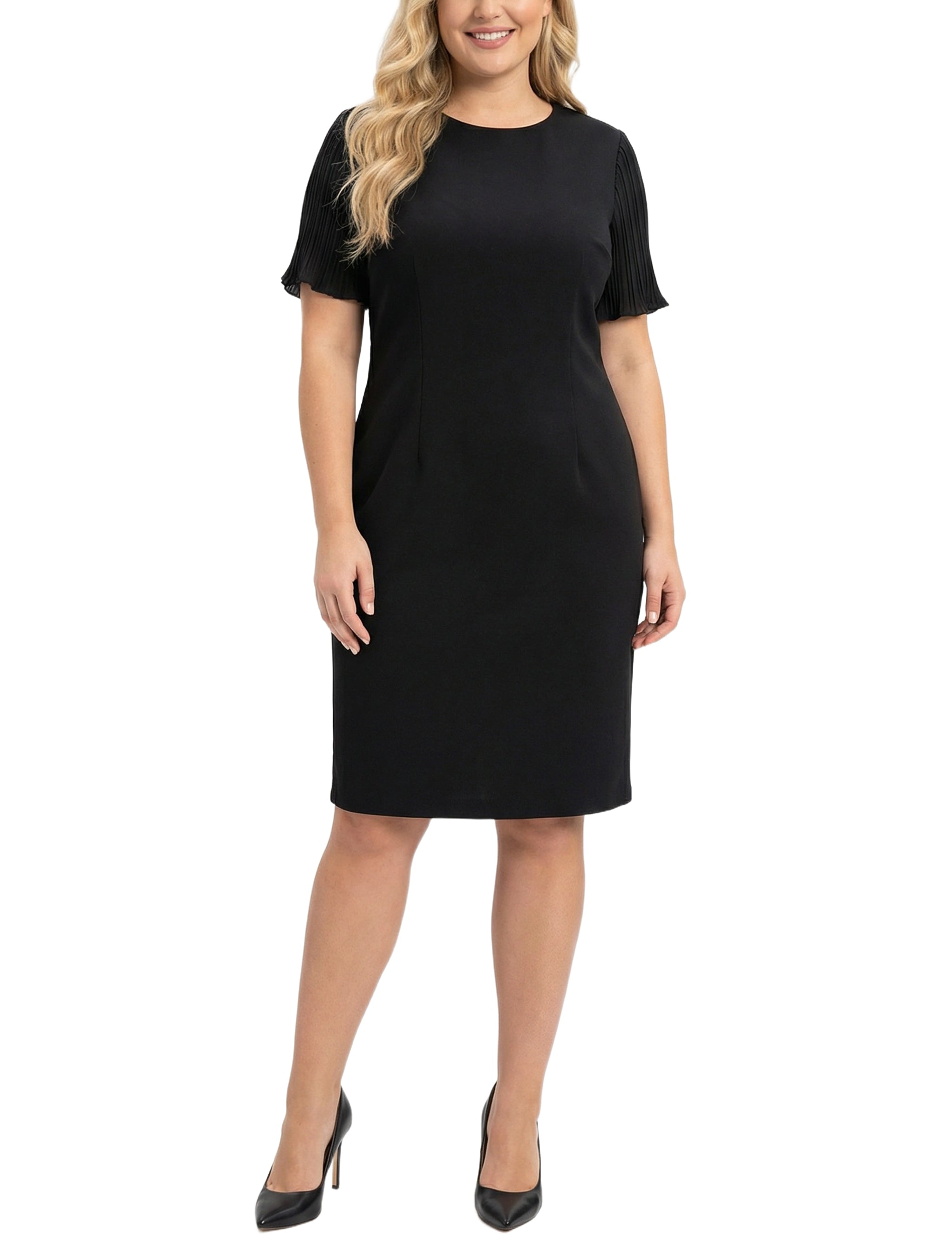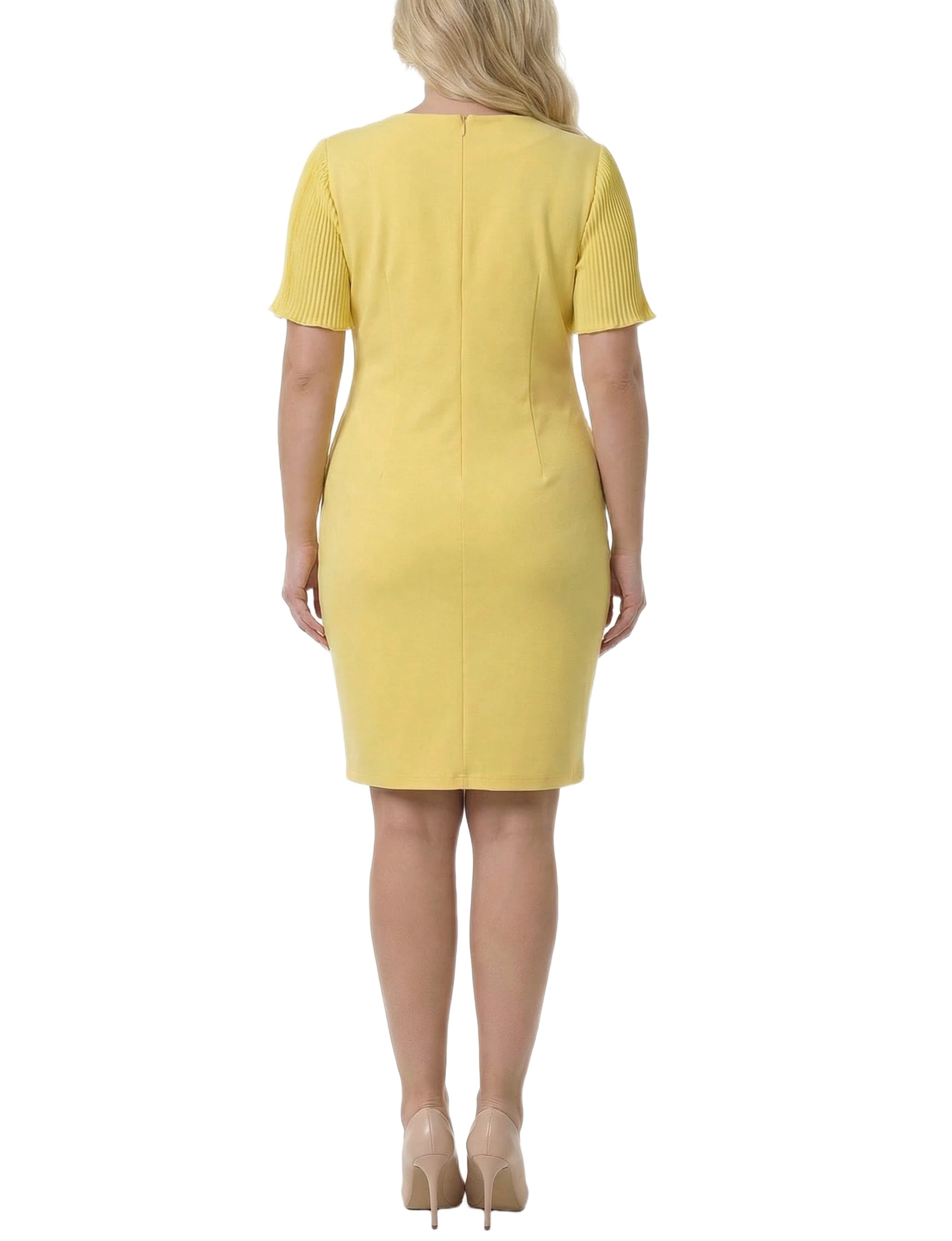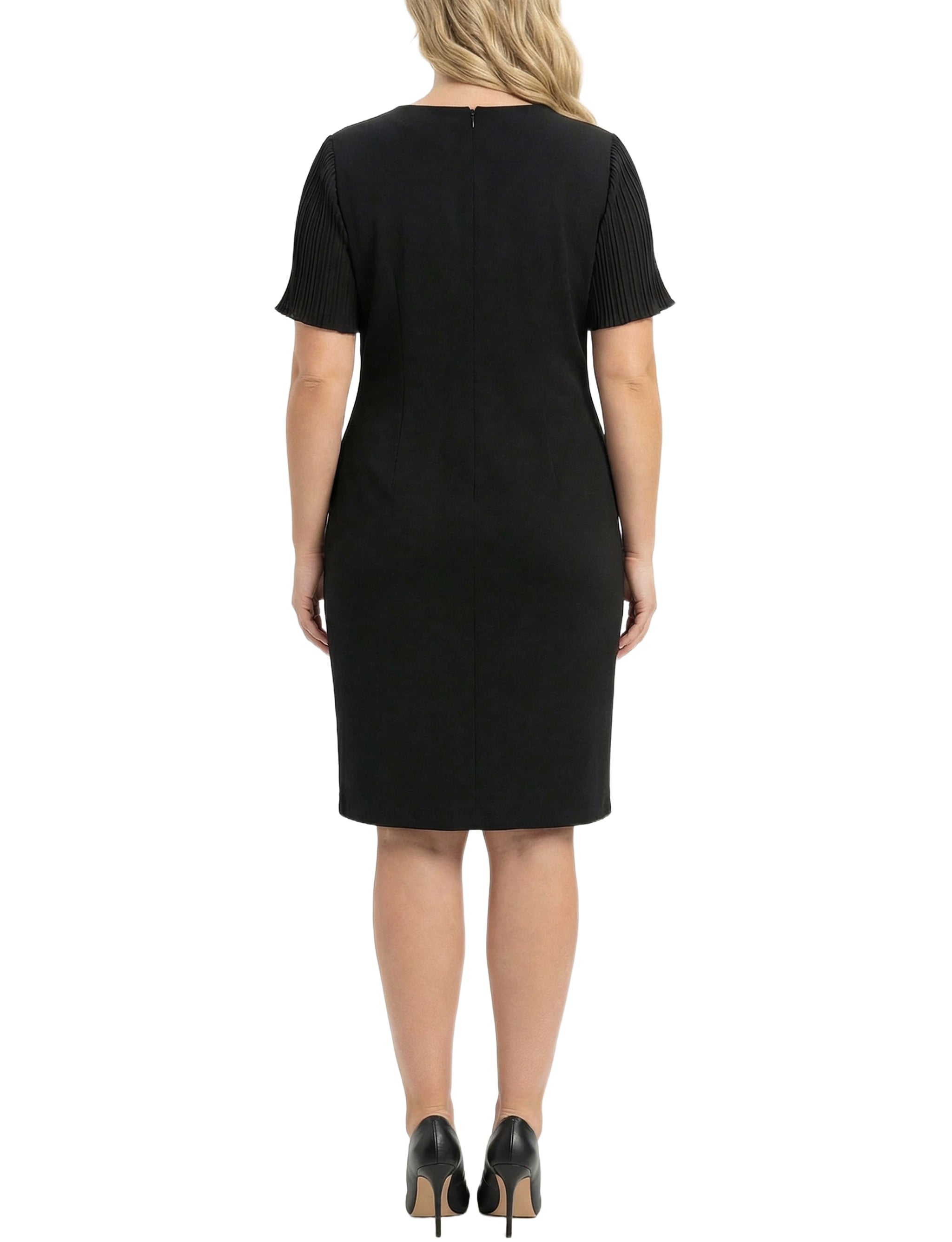 This elegant dress from NY Collection features a flattering knee-length silhouette with pleated sleeves and slim silhouette. Delicate ruffled sleeve edge adds movement and a feminine finish, making it perfect for both special occasions and polished everyday wear.