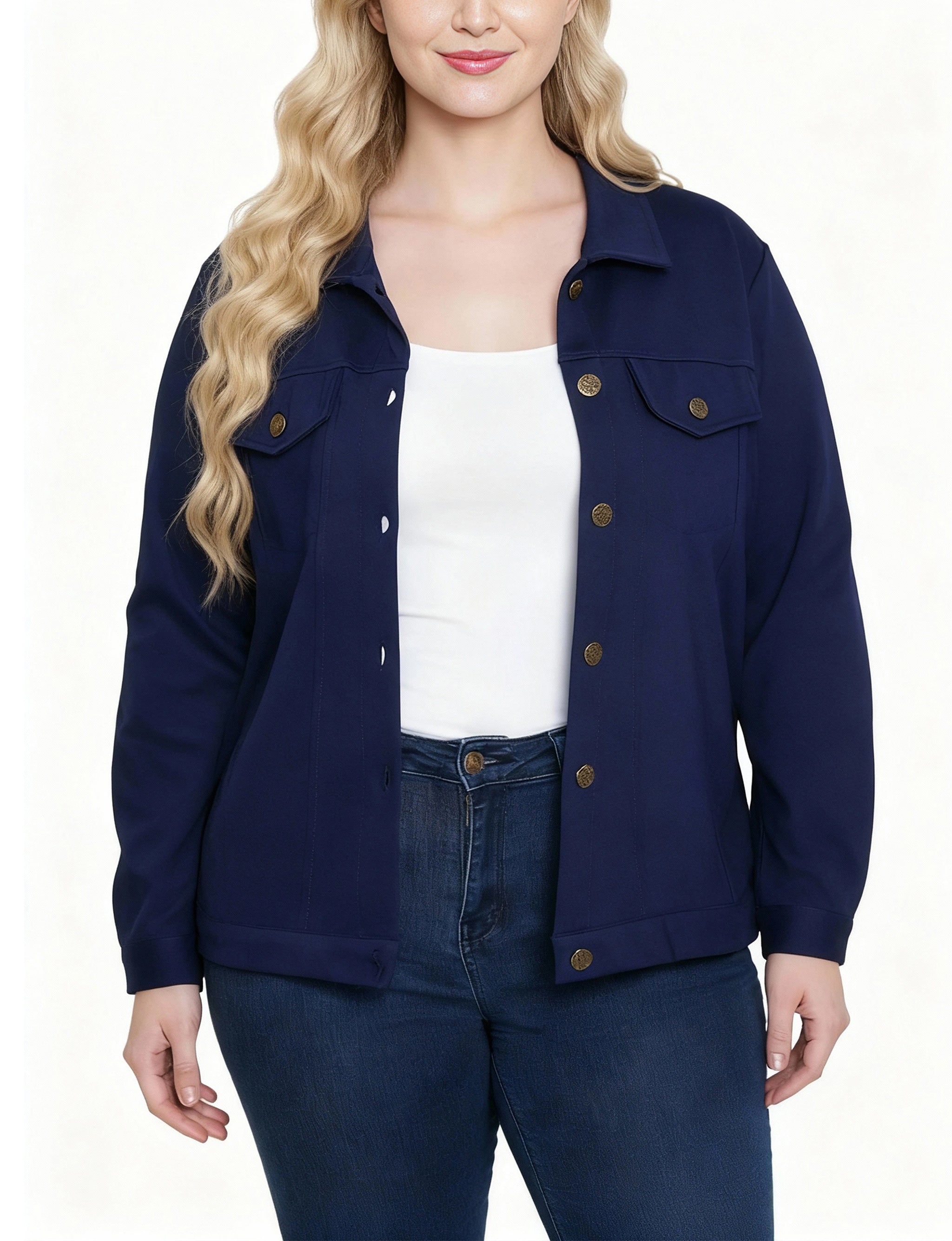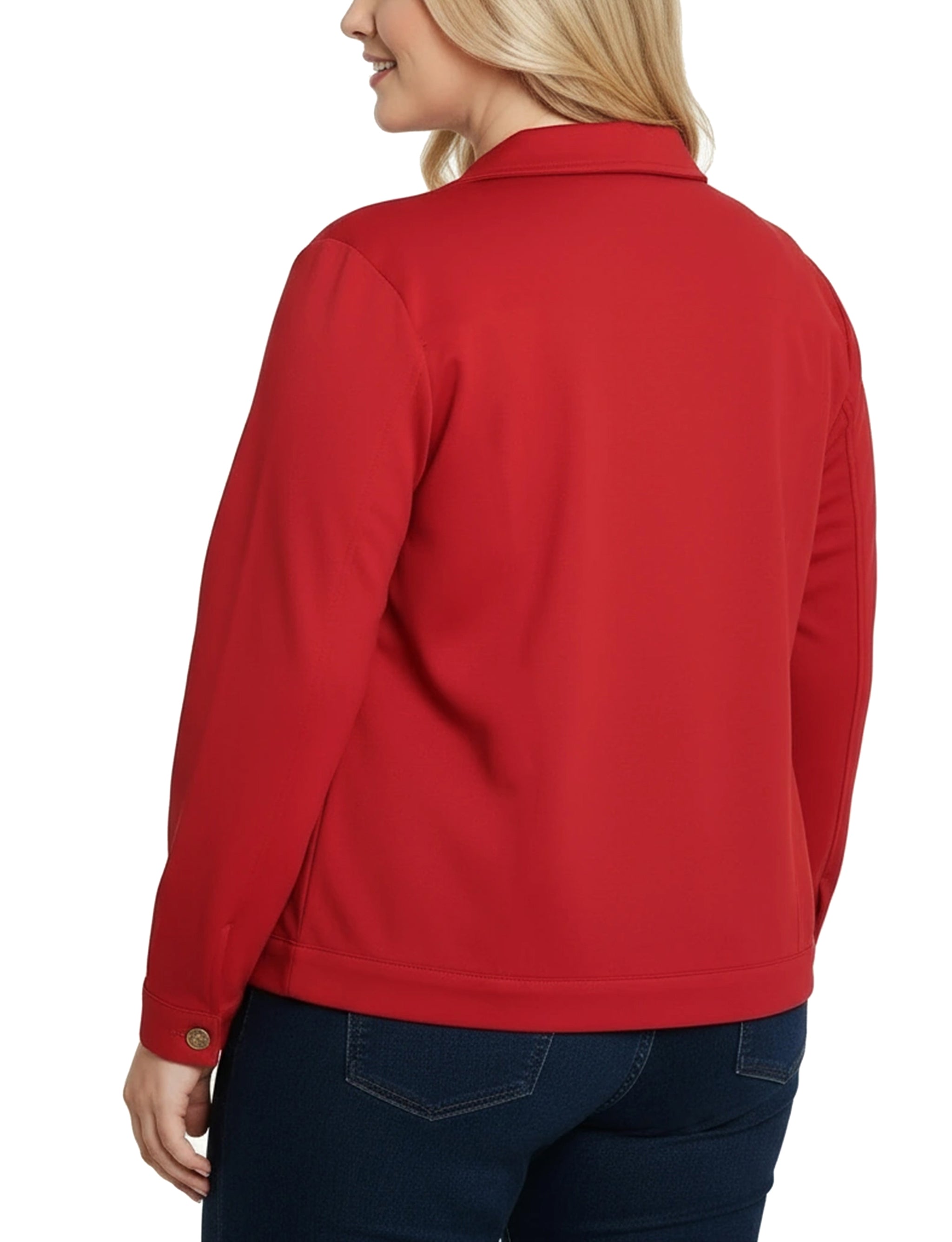 This NY Collection ponte jacket combines structured tailoring with comfortable stretch, making it a versatile layering piece for any season. Featuring a button-front design, chest flap pockets, and clean seam detailing, it's a timeless addition to your everyday wardrobe.