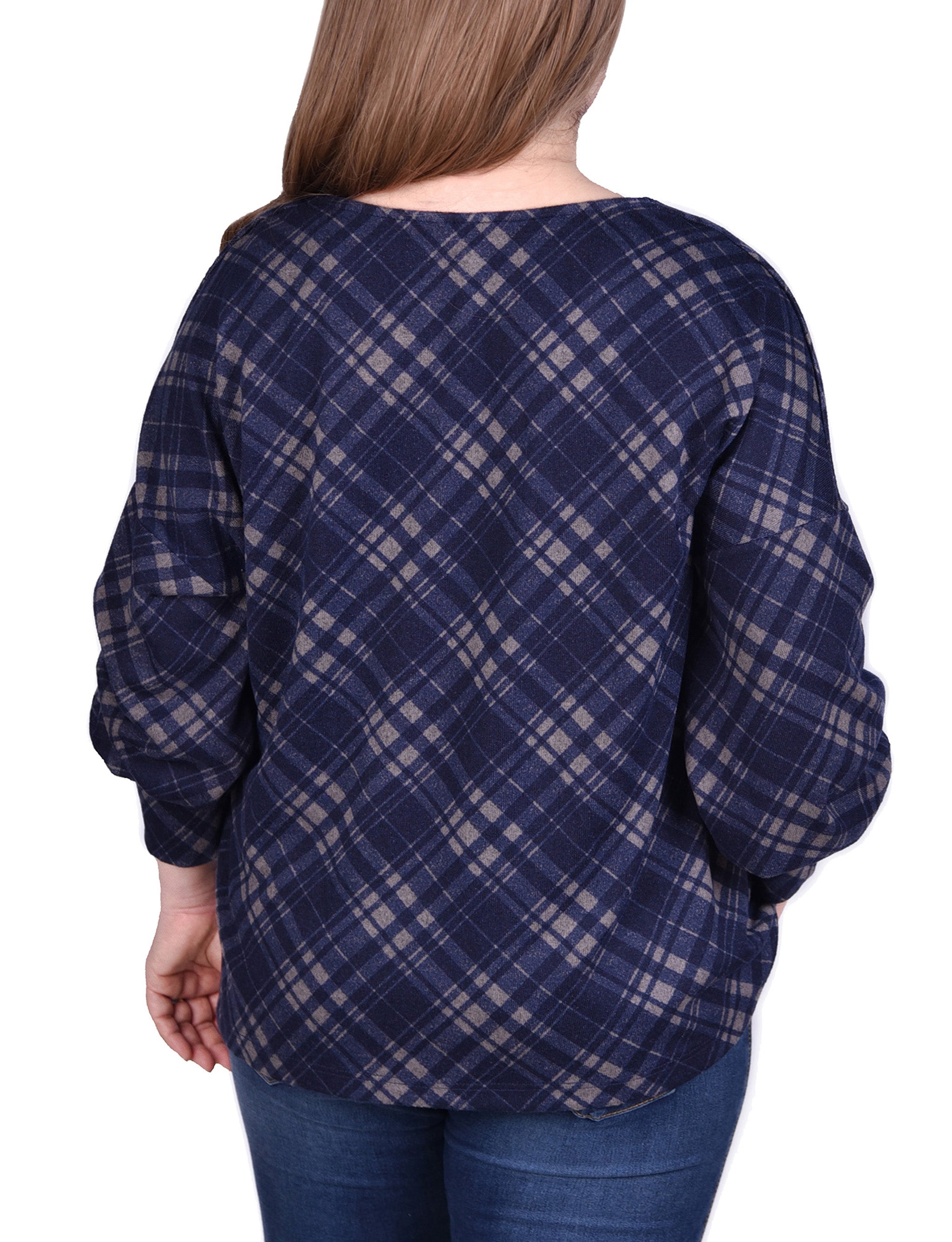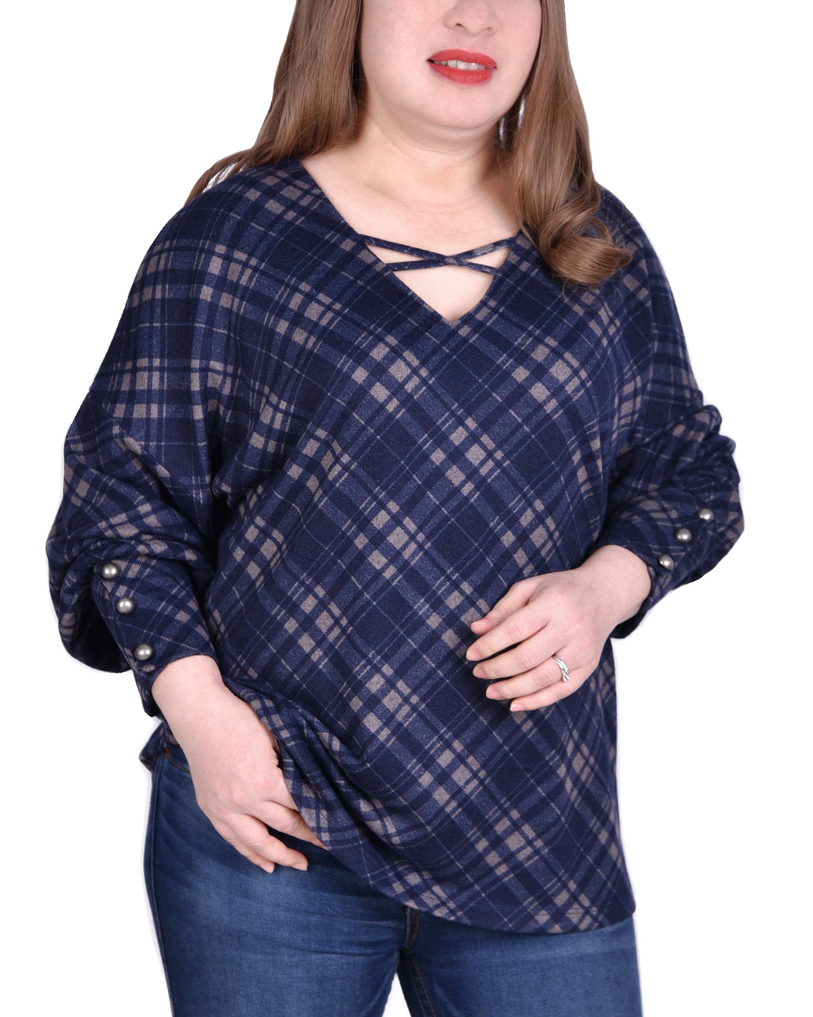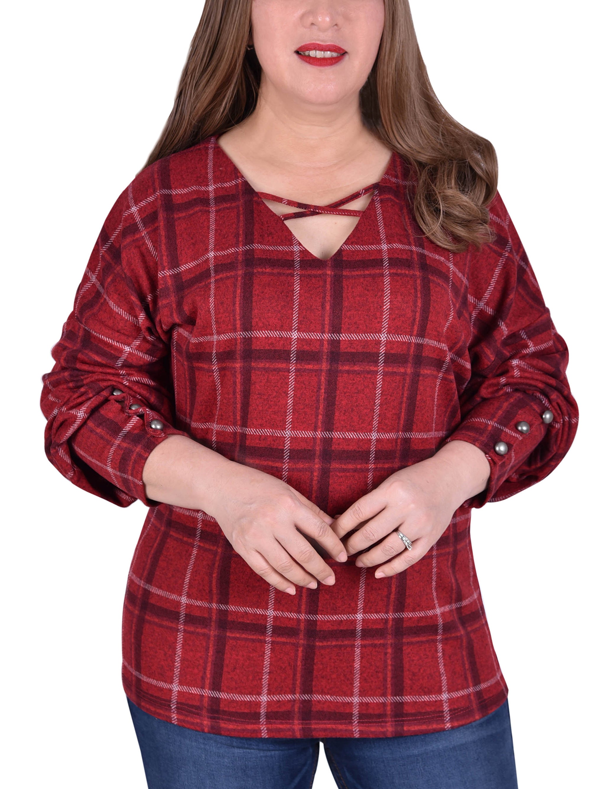 Look pretty in plaid in this criss cross neckline top from NY Collection, finished with cuff button details.