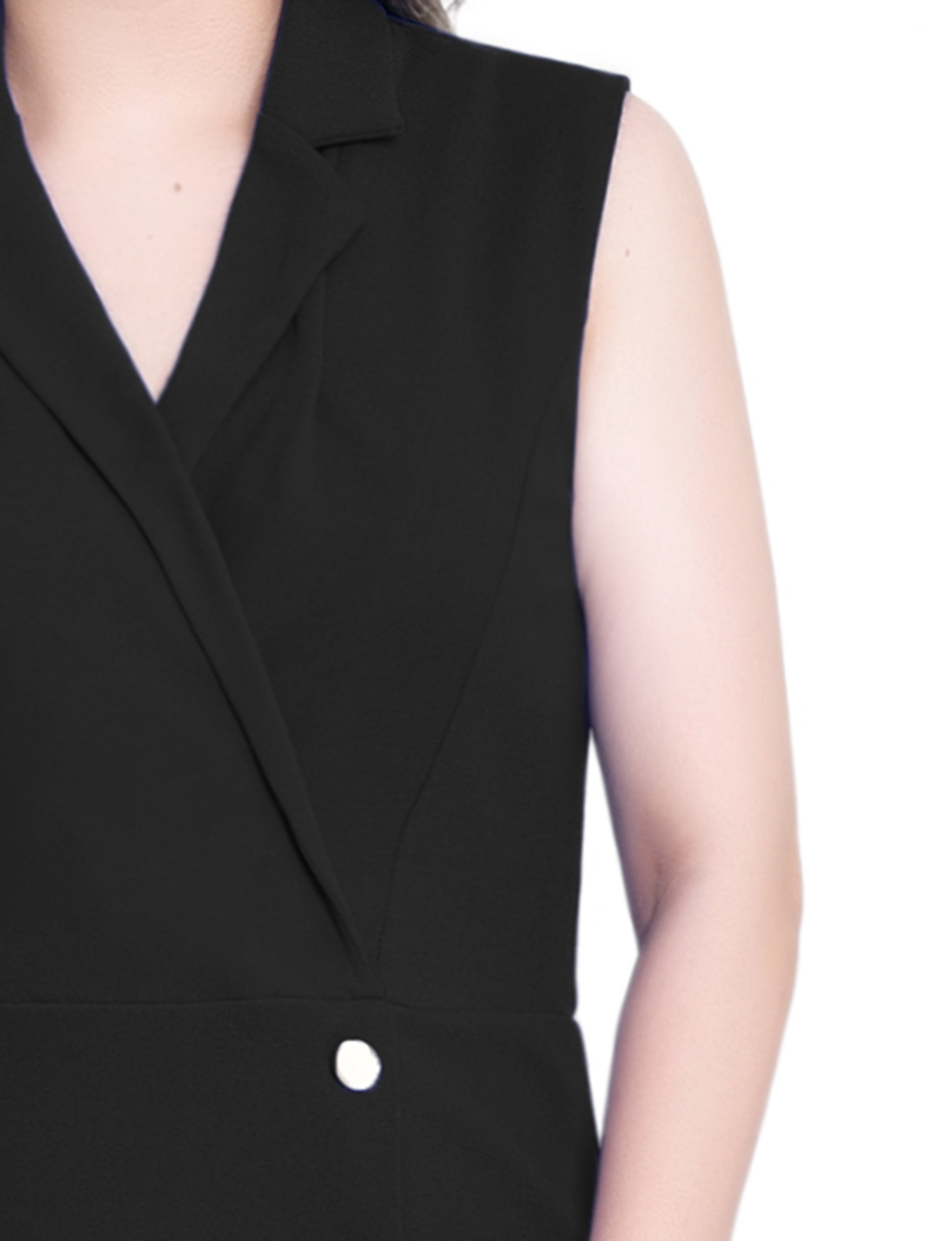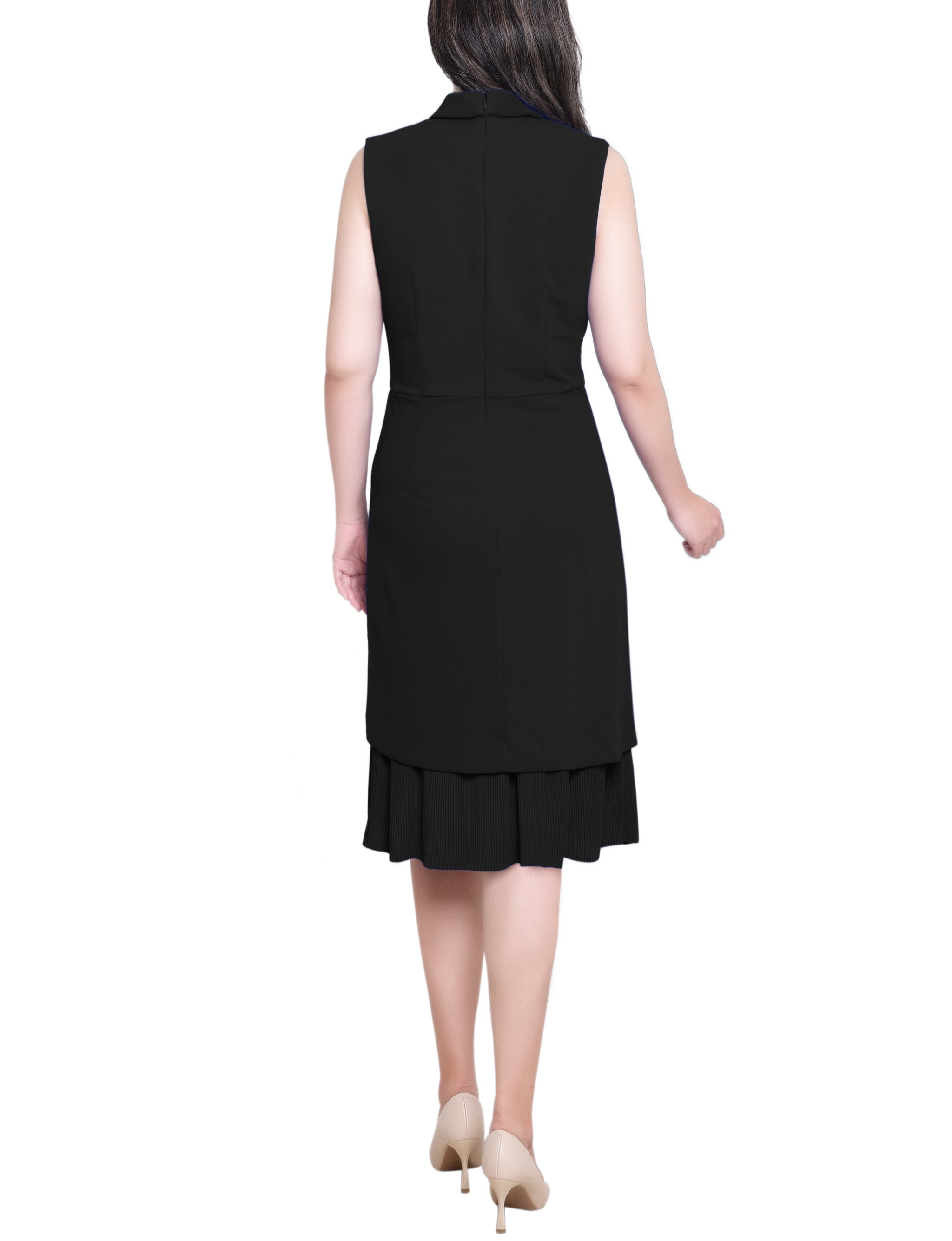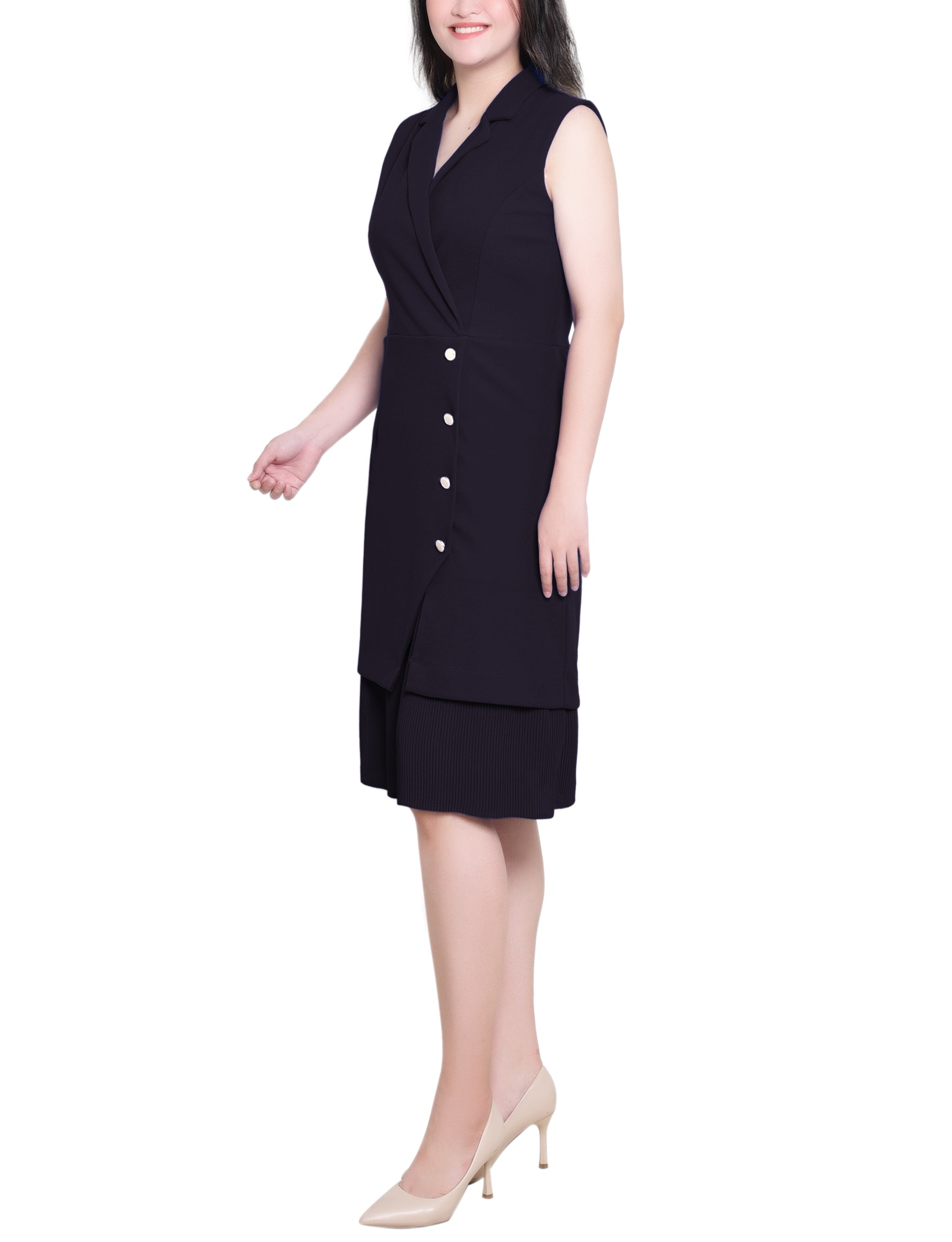 This sleeveless wrap-style dress from NY Collection features an asymmetric hem and side button detailing. A modern, structured piece ideal for professional or evening wear.