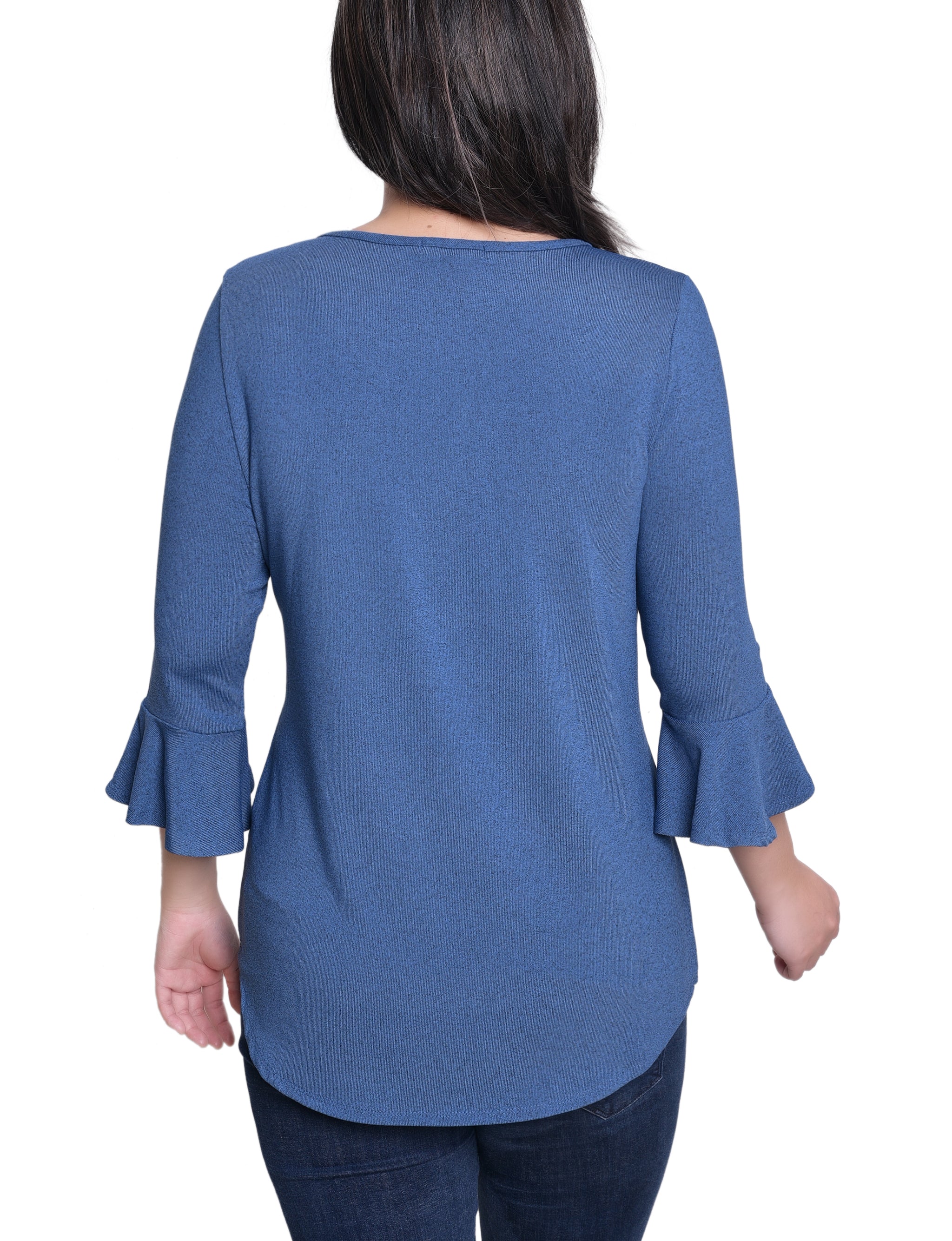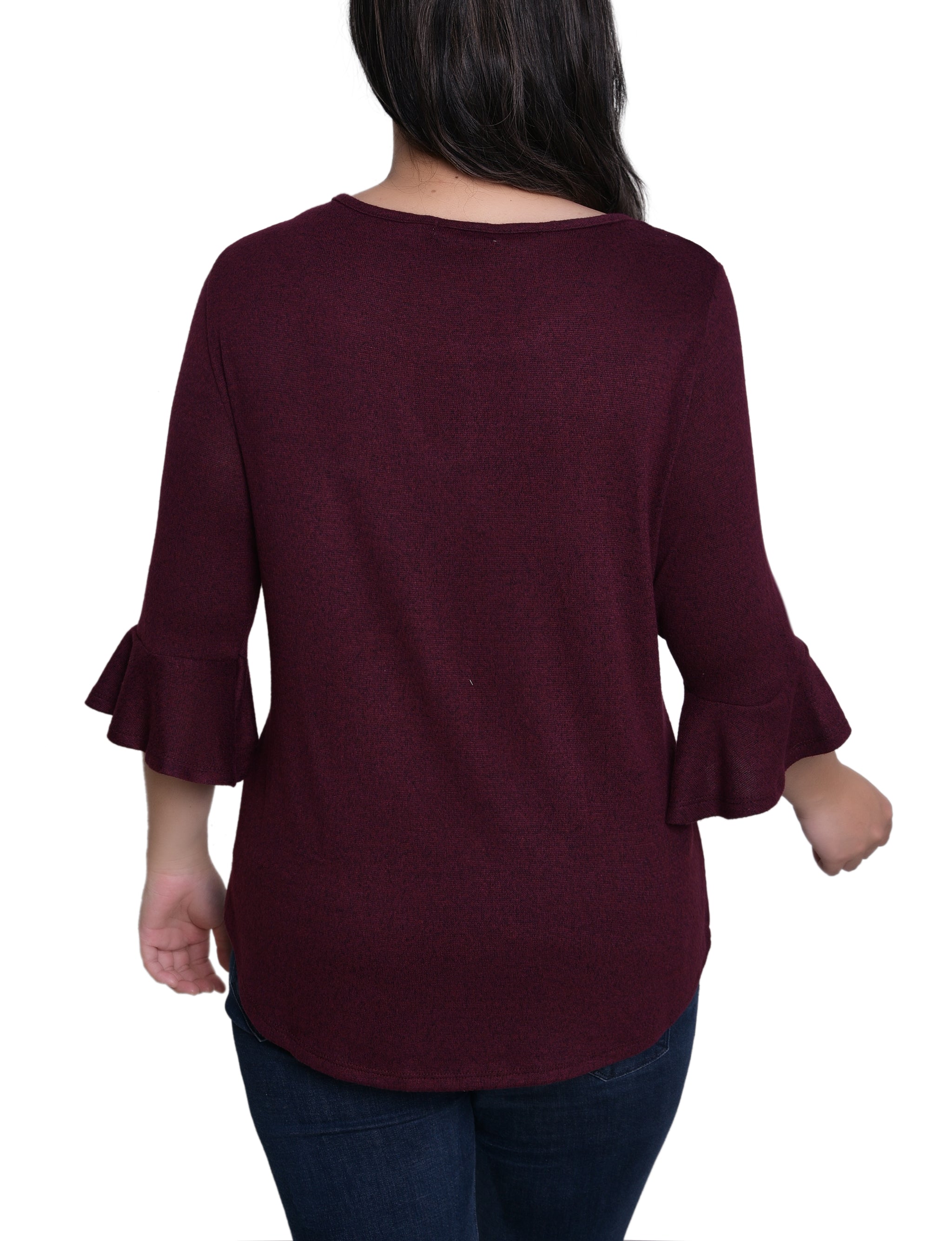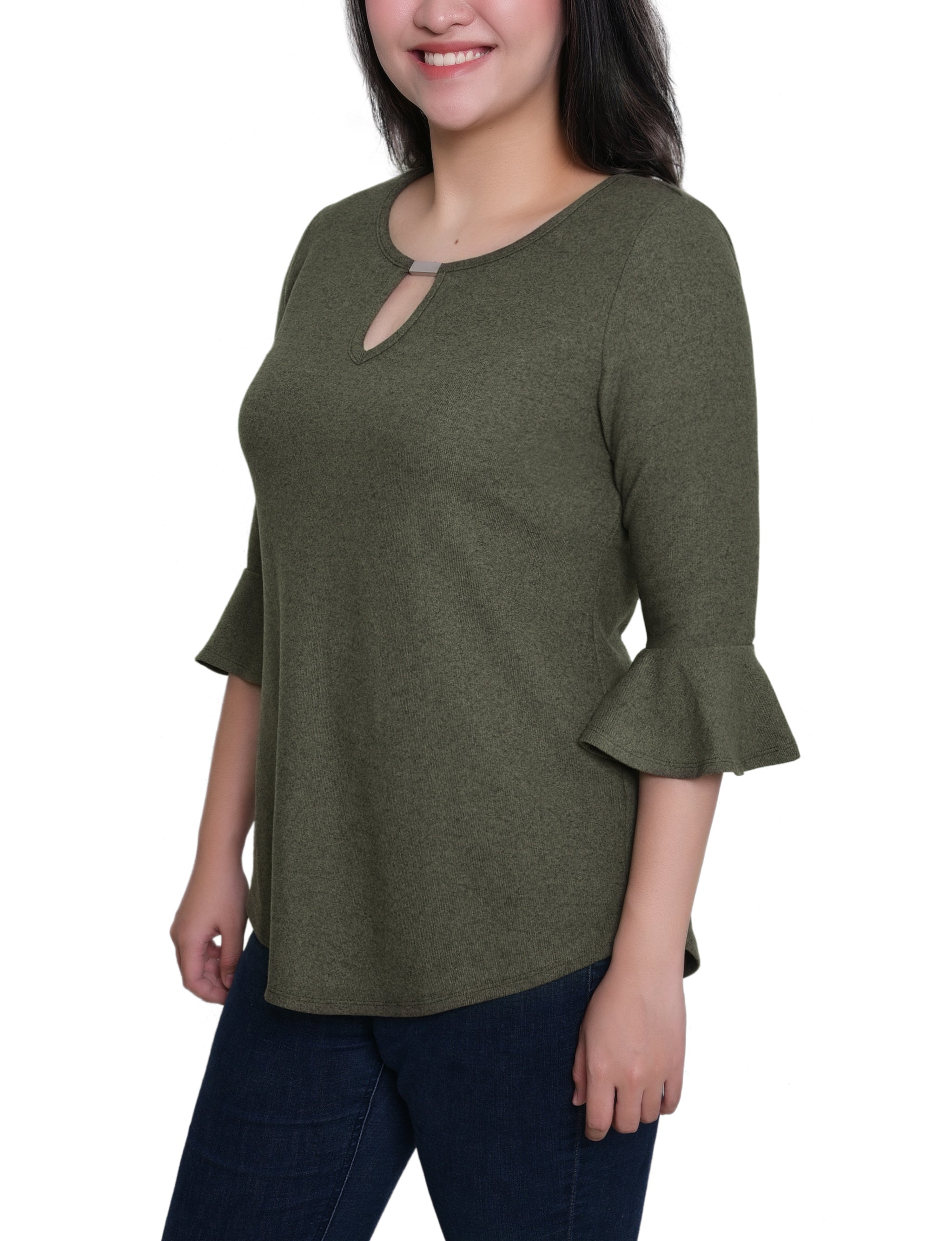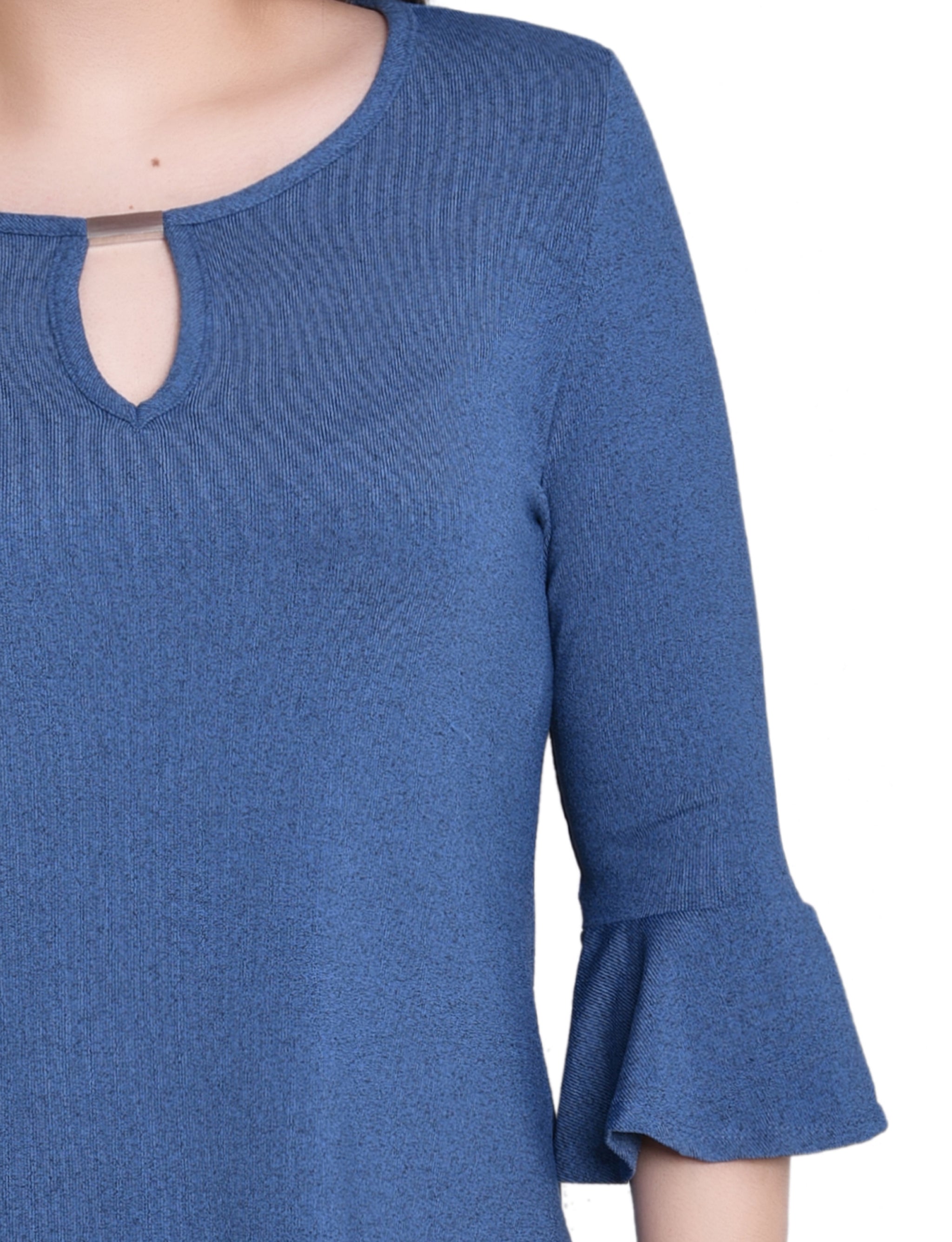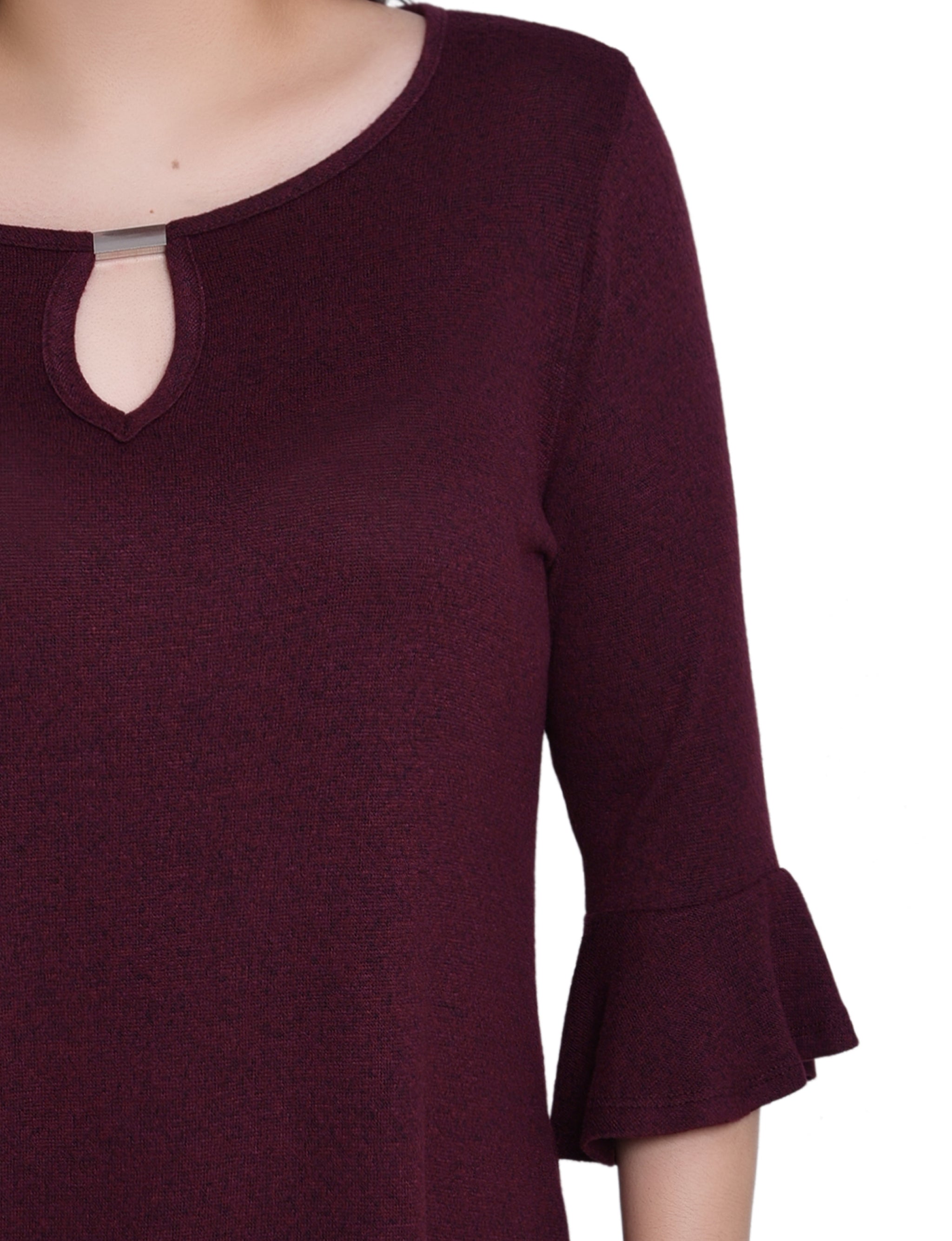Effortless and easy to wear, this NY Collection knit top features a relaxed silhouette with a keyhole neckline and flounced 3/4 sleeves for a touch of feminine flair. Perfect for casual days or dressed-up comfort.